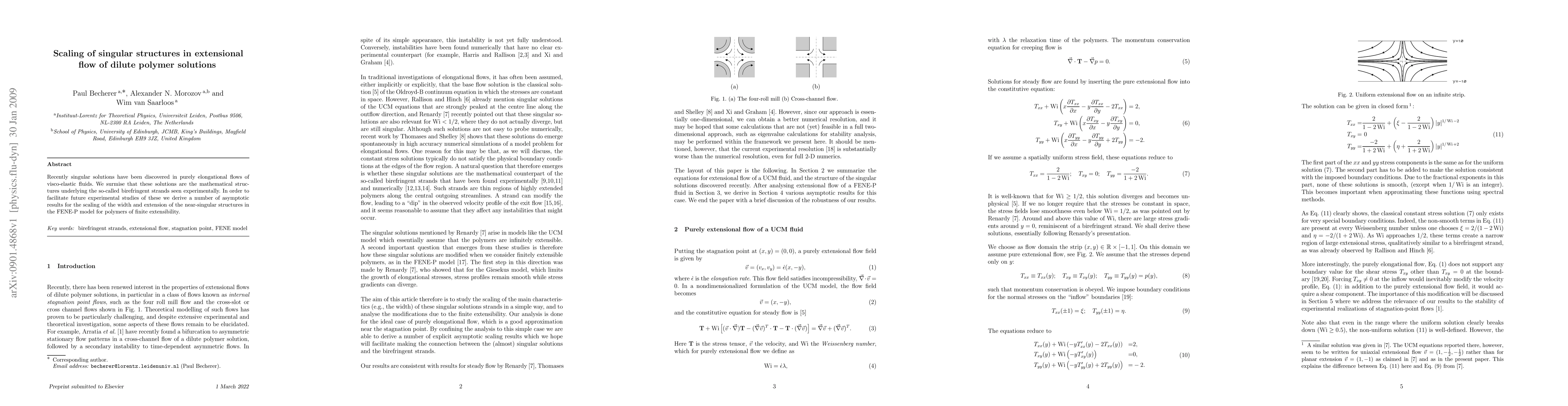 This paper investigates singular structures in extensional flow of dilute polymer solutions, revealing mathematical structures underlying experimental birefringent strands, and provides asymptotic results for the scaling of these structures.