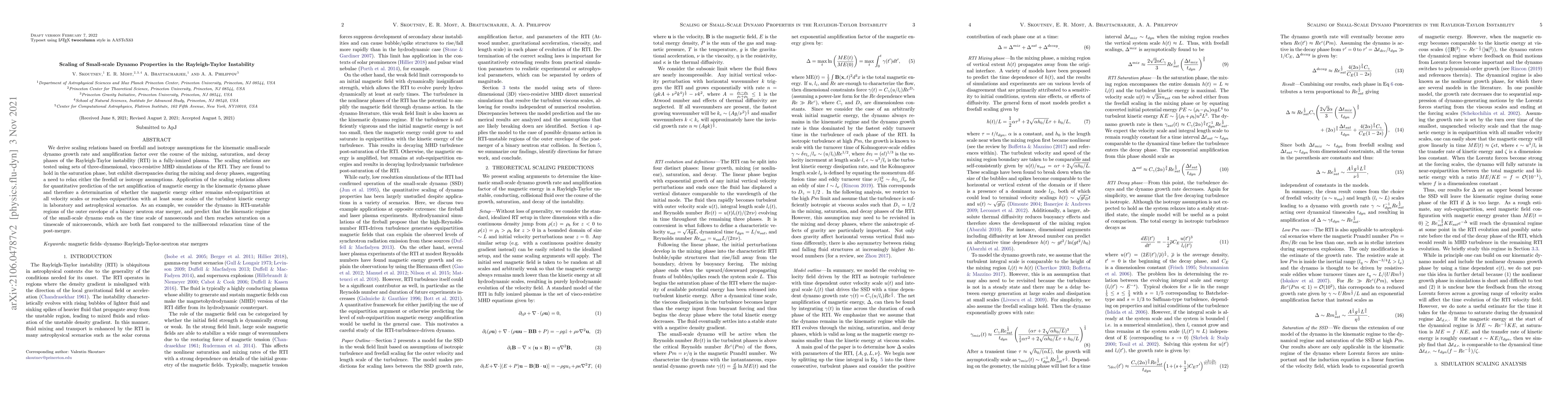 This paper derives scaling relations for the kinematic small-scale dynamo growth rate in the Rayleigh-Taylor instability, validated through MHD simulations. The relations hold in the saturation phase but show discrepancies in mixing and decay phases, indicating potential relaxation of assumptions.