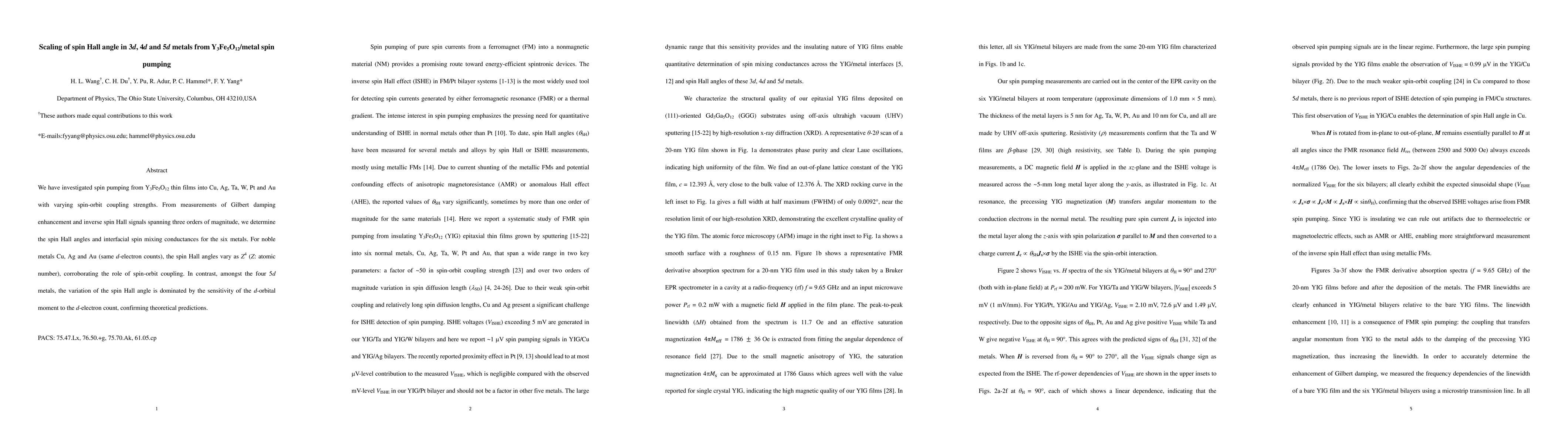This research investigates the spin Hall angle in various 3d, 4d, and 5d metals (Cu, Ag, Ta, W, Pt, and Au) when coupled with YIG via spin pumping. The study finds that spin Hall angles vary significantly with the atomic number, particularly as the fourth power, emphasizing the key role of spin-orbit coupling in the inverse spin Hall effect.