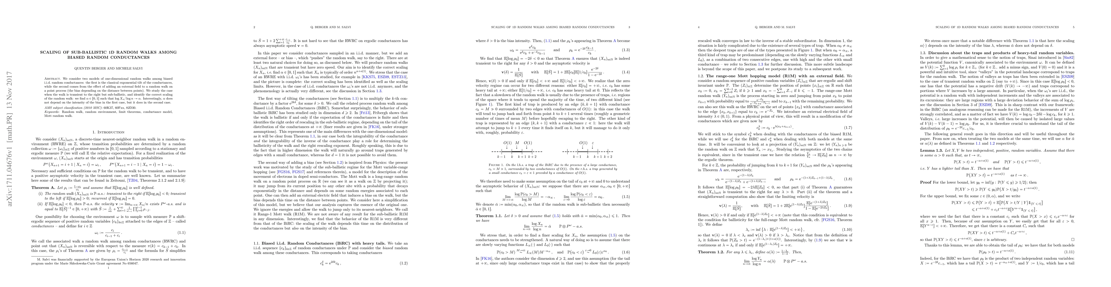 This paper investigates scaling behaviors of sub-ballistic 1D random walks in biased random conductance environments. It identifies a scaling exponent $\alpha \in[0,1]$ for transient walks, noting that $\alpha$ is independent of bias intensity in one model but dependent in another.
