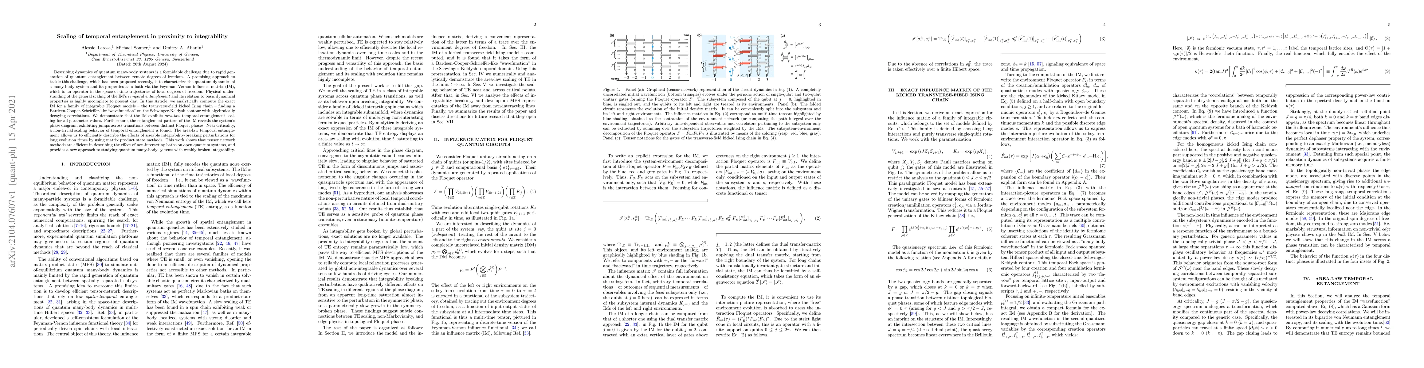 This paper analytically computes the Feynman-Vernon influence matrix for integrable Floquet models, revealing area-law temporal entanglement scaling and a non-trivial scaling behavior near criticality. It demonstrates tensor network methods' efficiency in describing the effects of integrability-breaking perturbations on quantum many-body systems.