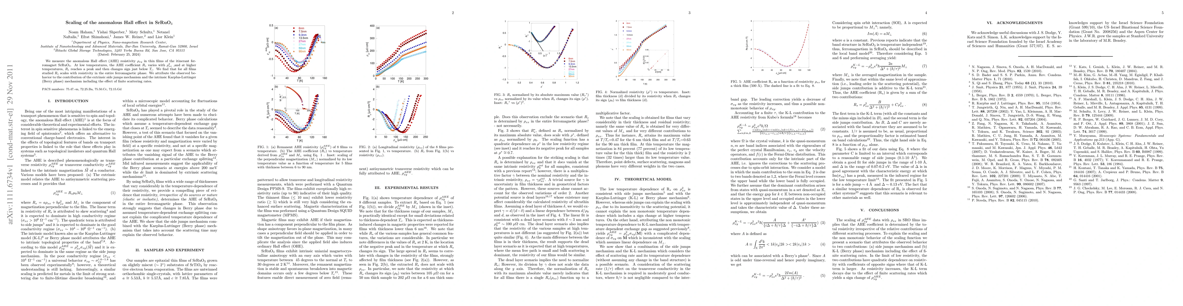 This paper investigates the anomalous Hall effect in SrRuO$_3$ thin films, finding that the AHE coefficient scales with resistivity across the ferromagnetic phase. The observed behavior is attributed to both extrinsic side jumps and intrinsic Berry phase mechanisms, including finite scattering effects.