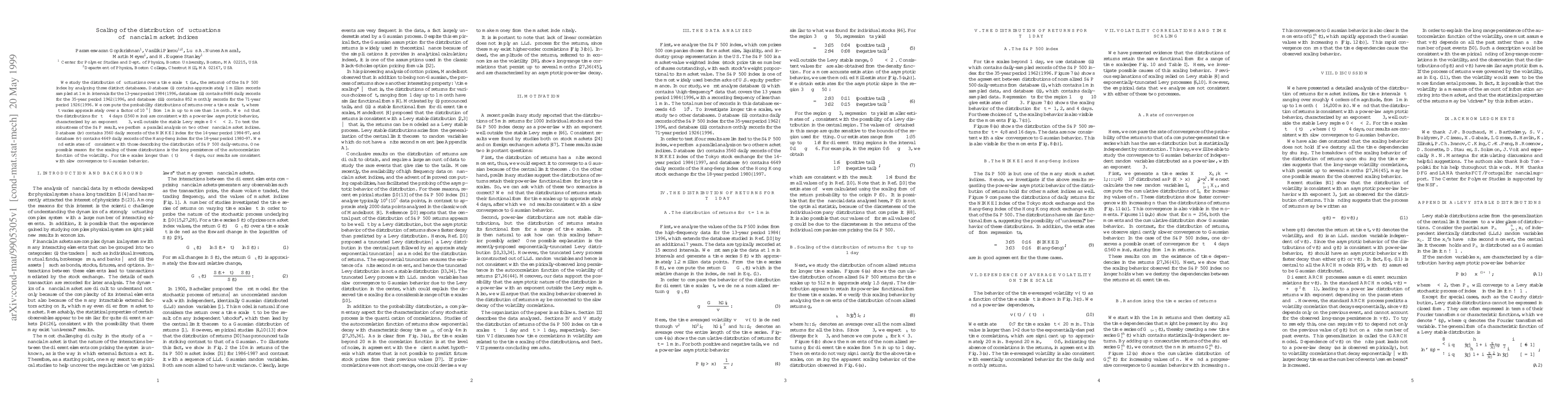 We study the distribution of fluctuations over a time scale $\Delta t$ (i.e., the returns) of the S&P 500 index by analyzing three distinct databases. Database (i) contains approximately 1 million records sampled at 1 min intervals for the 13-year period 1984-1996, database (ii) contains 8686 daily records for the 35-year period 1962-1996, and database (iii) contains 852 monthly records for the 71-year period 1926-1996. We compute the probability distributions of returns over a time scale $\Delta t$, where $\Delta t$ varies approximately over a factor of 10^4 - from 1 min up to more than 1 month. We find that the distributions for $\Delta t \leq$ 4 days (1560 mins) are consistent with a power-law asymptotic behavior, characterized by an exponent $\alpha \approx 3$, well outside the stable L\'evy regime $0 < \alpha < 2$. To test the robustness of the S&P result, we perform a parallel analysis on two other financial market indices. Database (iv) contains 3560 daily records of the NIKKEI index for the 14-year period 1984-97, and database (v) contains 4649 daily records of the Hang-Seng index for the 18-year period 1980-97. We find estimates of $\alpha$ consistent with those describing the distribution of S&P 500 daily-returns. One possible reason for the scaling of these distributions is the long persistence of the autocorrelation function of the volatility. For time scales longer than $(\Delta t)_{\times} \approx 4$ days, our results are consistent with slow convergence to Gaussian behavior.