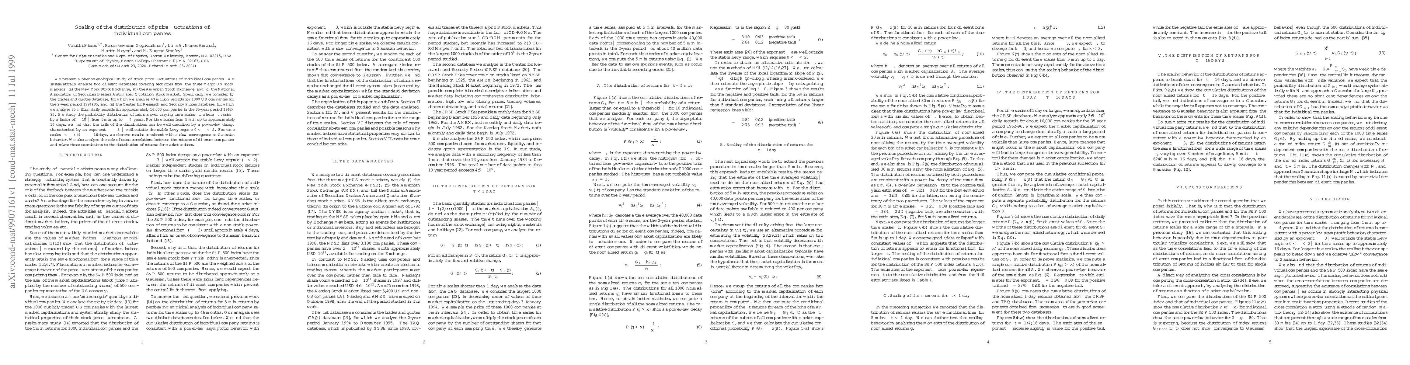 We present a phenomenological study of stock price fluctuations of individual companies. We systematically analyze two different databases covering securities from the three major US stock markets: (a) the New York Stock Exchange, (b) the American Stock Exchange, and (c) the National Association of Securities Dealers Automated Quotation stock market. Specifically, we consider (i) the trades and quotes database, for which we analyze 40 million records for 1000 US companies for the 2-year period 1994--95, and (ii) the Center for Research and Security Prices database, for which we analyze 35 million daily records for approximately 16,000 companies in the 35-year period 1962--96. We study the probability distribution of returns over varying time scales $\Delta t$, where $\Delta t$ varies by a factor of $\approx 10^5$---from 5 min up to $\approx$ 4 years. For time scales from 5~min up to approximately 16~days, we find that the tails of the distributions can be well described by a power-law decay, characterized by an exponent $\alpha \approx 3$ ---well outside the stable L\'evy regime $0 < \alpha < 2$. For time scales $\Delta t \gg (\Delta t)_{\times} \approx 16 $days, we observe results consistent with a slow convergence to Gaussian behavior. We also analyze the role of cross correlations between the returns of different companies and relate these correlations to the distribution of returns for market indices.