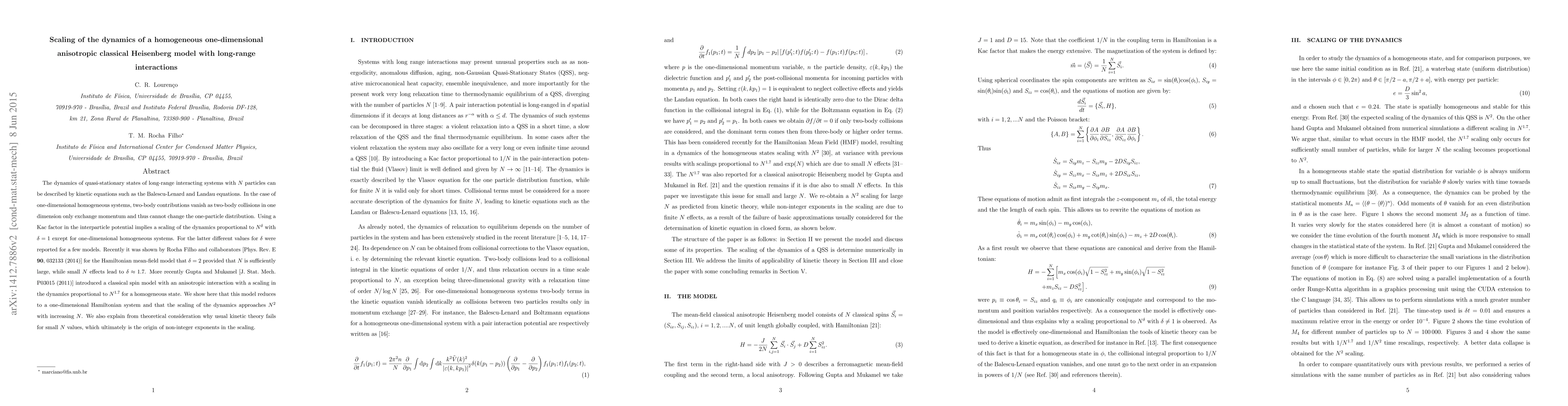 The dynamics of quasi-stationary states of long-range interacting systems with $N$ particles can be described by kinetic equations such as the Balescu-Lenard and Landau equations. In the case of one-dimensional homogeneous systems, two-body contributions vanish as two-body collisions in one dimension only exchange momentum and thus cannot change the one-particle distribution. Using a Kac factor in the interparticle potential implies a scaling of the dynamics proportional to $N^\delta$ with $\delta=1$ except for one-dimensional homogeneous systems. For the latter different values for $\delta$ were reported for a few models. Recently it was show by Rocha Filho and collaborators [Phys.\ Rev.\ E {\bf 90}, 032133 (2014)] for the Hamiltonian mean-field model that $\delta=2$ provided that $N$ is sufficiently large, while small $N$ effects lead to $\delta\approx1.7$. More recently Gupta and Mukamel [J.\ Stat.\ Mech.\ P03015 (2011)] introduced a classical spin model with an anisotropic interaction with a scaling in the dynamics proportional to $N^{1.7}$ for a homogeneous state. We show here that this model reduces to a one-dimensional Hamiltonian system and that the scaling of the dynamics approaches $N^2$ with increasing $N$. We also explain from theoretical consideration why usual kinetic theory fails for small $N$ values, which ultimately is the origin of non-integer exponents in the scaling.