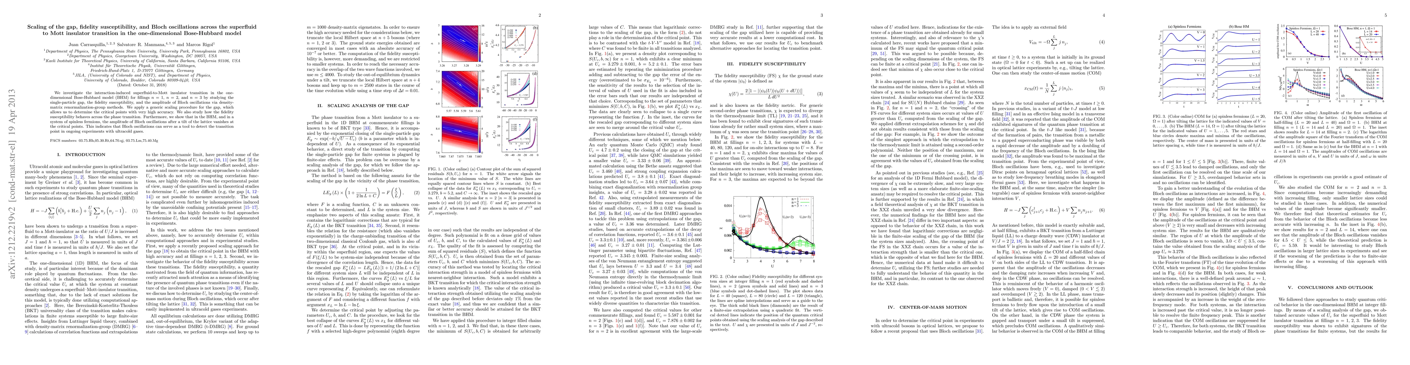 This paper investigates the superfluid-to-Mott insulator transition in the one-dimensional Bose-Hubbard model using density-matrix renormalization-group methods, focusing on the scaling of the single-particle gap, fidelity susceptibility, and Bloch oscillations. It reveals that Bloch oscillations vanish at critical points, suggesting they can detect transition points in ultracold gas experiments.