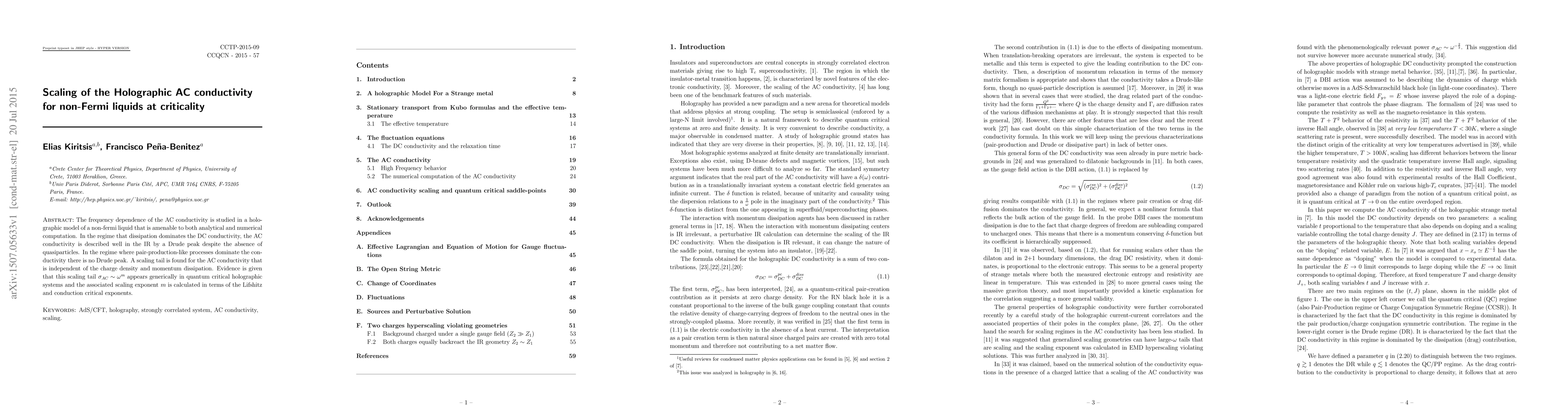 The frequency dependence of the AC conductivity is studied in a holographic model of a non-fermi liquid that is amenable to both analytical and numerical computation. In the regime that dissipation dominates the DC conductivity, the AC conductivity is described well in the IR by a Drude peak despite the absence of quasiparticles. In the regime where pair-production-like processes dominate the conductivity there is no Drude peak. A scaling tail is found for the AC conductivity that is independent of the charge density and momentum dissipation. Evidence is given that this scaling tail $\sigma_{AC}\sim \omega^m$ appears generically in quantum critical holographic systems and the associated scaling exponent $m$ is calculated in terms of the Lifshitz and conduction critical exponents.