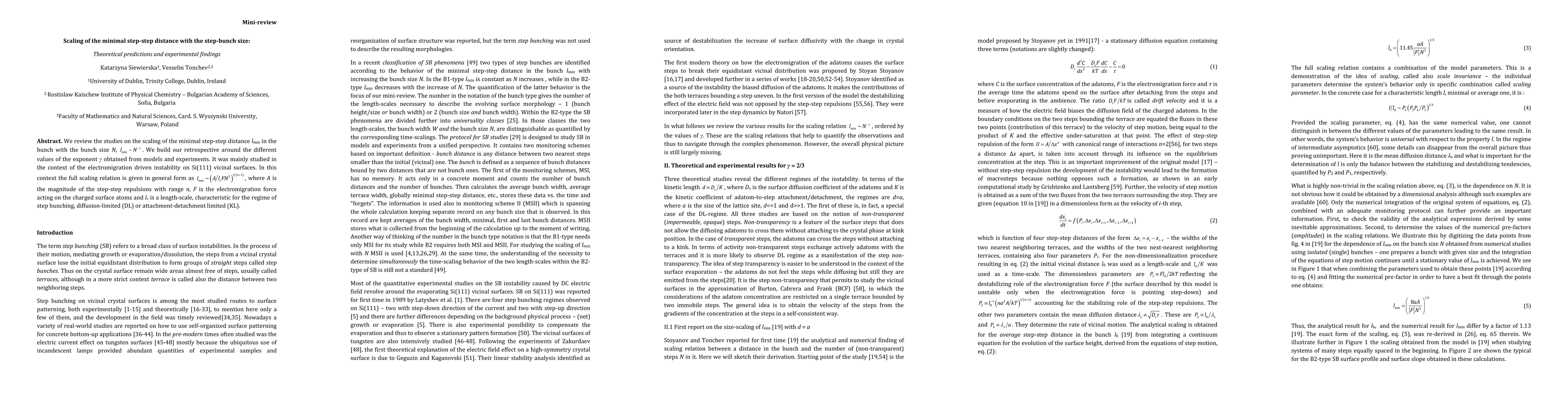This mini-review explores the scaling of minimal step-step distance (lmin) with step-bunch size (N), represented as lmin~N^(-u03b3). Different values of the exponent u03b3, derived from models and experiments, are discussed, mainly in the context of electromigration-induced instability on Si(111) vicinal surfaces. The scaling relation is expressed as lmin ~ (A/l_cFN^2)^[1/(n+1)], where A denotes step-step repulsion magnitude, F is the electromigration force, and l_c is a length-scale for step bunching regimes (diffusion-limited or attachment-detachment limited).