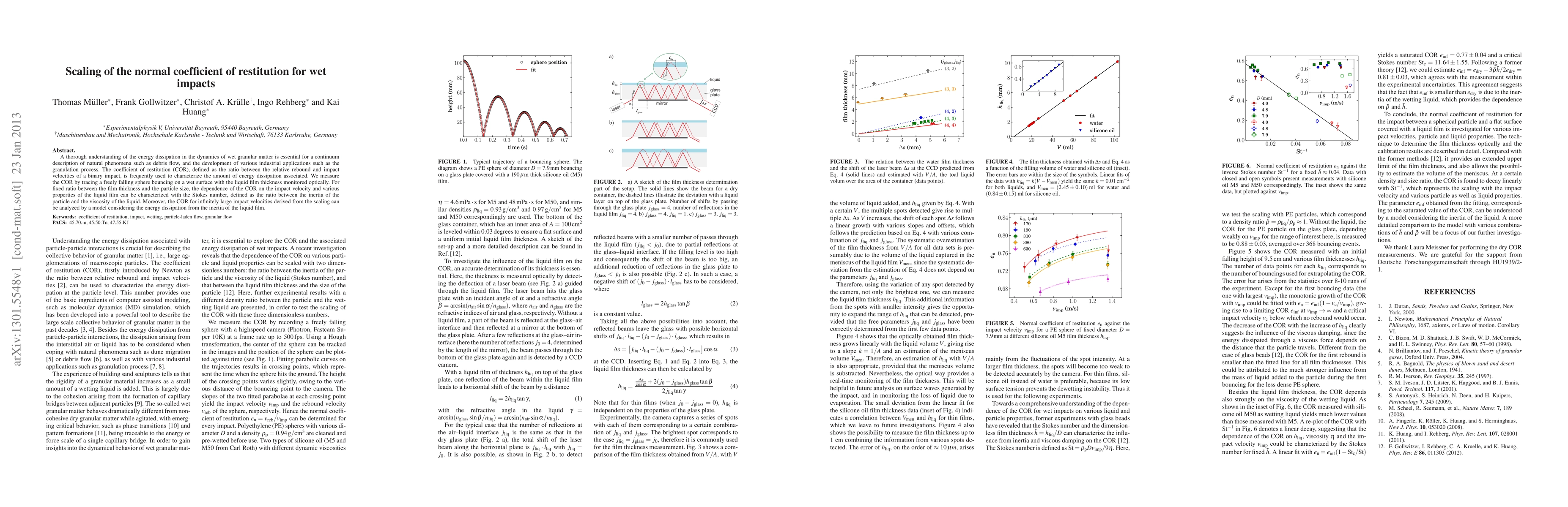 A thorough understanding of the energy dissipation in the dynamics of wet granular matter is essential for a continuum description of natural phenomena such as debris flow, and the development of various industrial applications such as the granulation process. The coefficient of restitution (COR), defined as the ratio between the relative rebound and impact velocities of a binary impact, is frequently used to characterize the amount of energy dissipation associated. We measure the COR by tracing a freely falling sphere bouncing on a wet surface with the liquid film thickness monitored optically. For fixed ratio between the film thickness and the particle size, the dependence of the COR on the impact velocity and various properties of the liquid film can be characterized with the Stokes number, defined as the ratio between the inertia of the particle and the viscosity of the liquid. Moreover, the COR for infinitely large impact velocities derived from the scaling can be analyzed by a model considering the energy dissipation from the inertia of the liquid film.