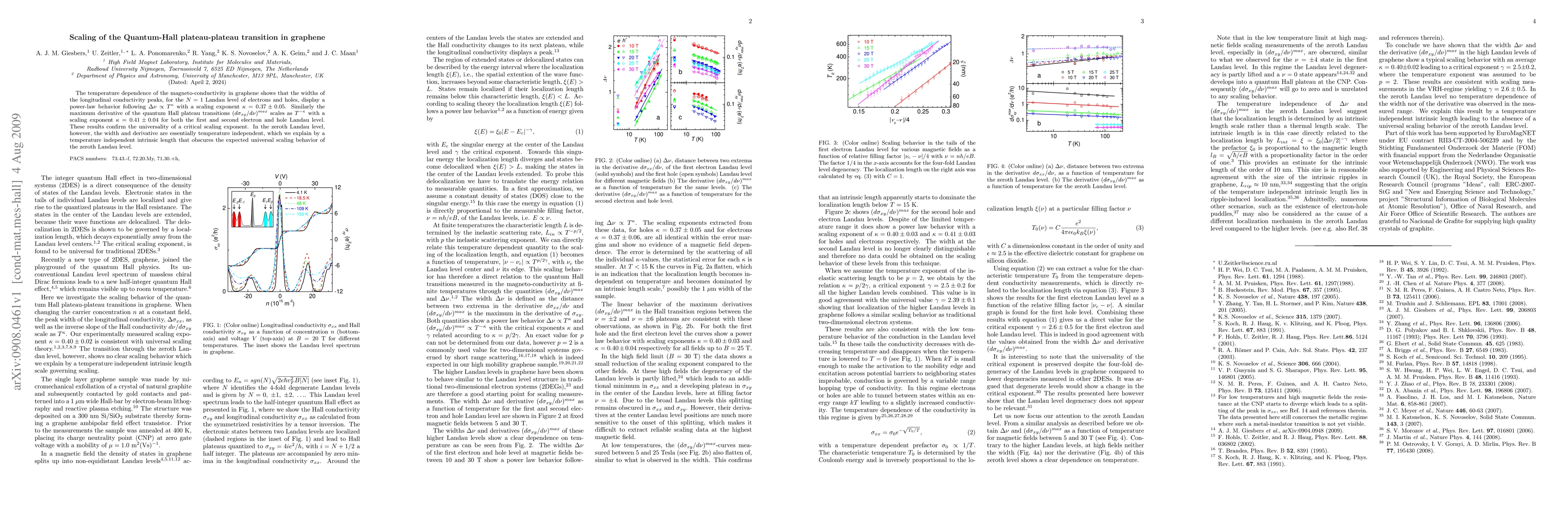 This paper investigates the temperature dependence of magneto-conductivity in graphene, finding that the quantum Hall plateau transition scales with a critical exponent $\kappa = 0.37\pm0.05$ for the N=1 Landau level. The study confirms the universality of this scaling behavior across electron and hole Landau levels.