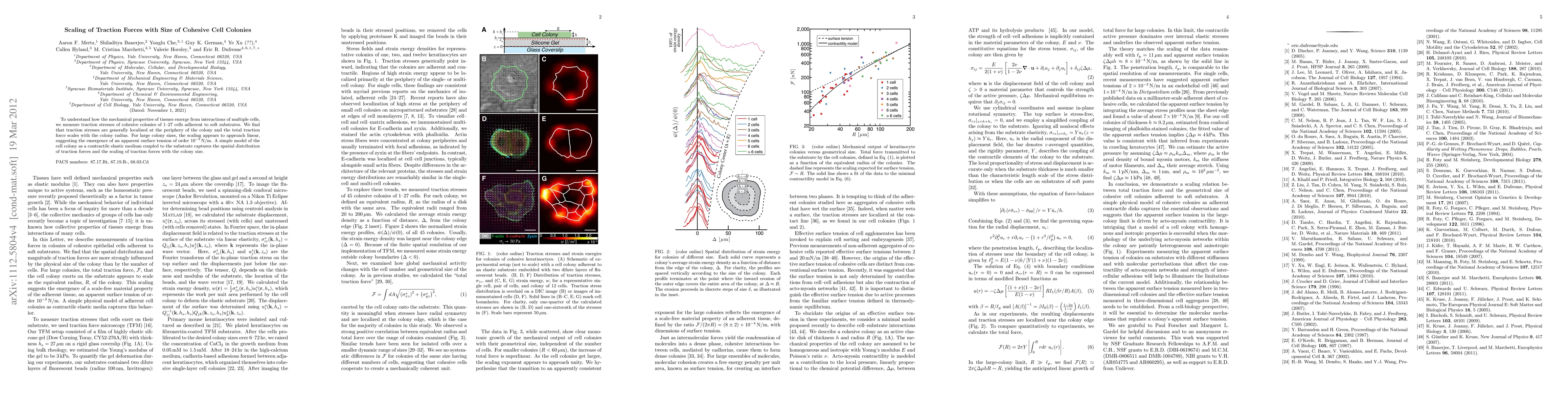 This study measures traction stresses in cohesive cell colonies of varying sizes, finding that total traction force scales with colony radius, approaching linear scaling for large colonies, indicative of an emergent surface tension. A model of the colony as a contractile elastic medium explains the observed traction force distribution and scaling behavior.