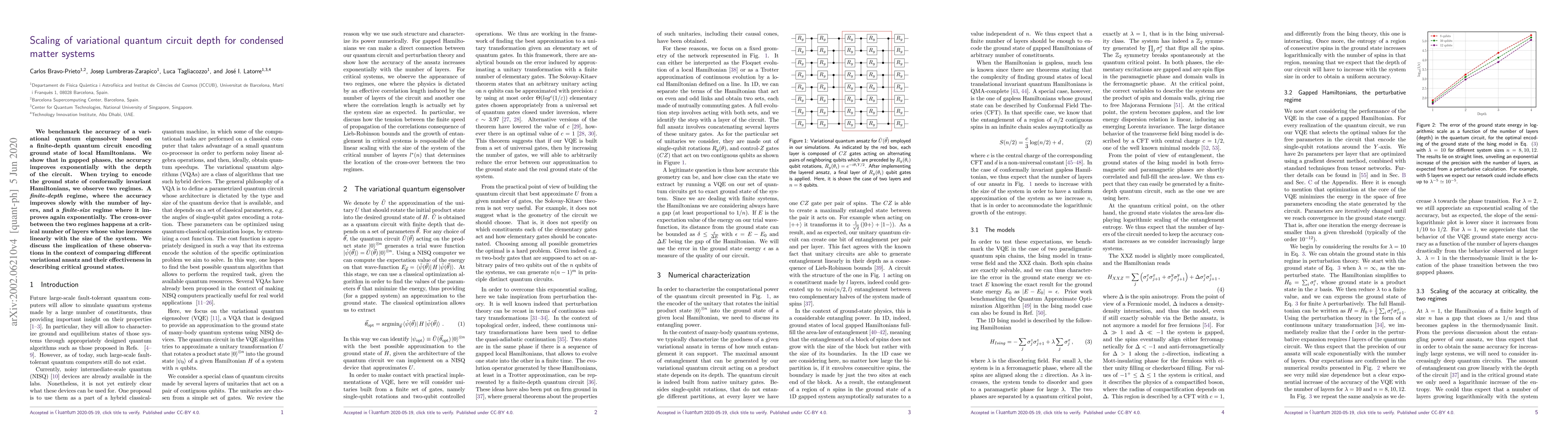 We benchmark the accuracy of a variational quantum eigensolver based on a finite-depth quantum circuit encoding ground state of local Hamiltonians. We show that in gapped phases, the accuracy improves exponentially with the depth of the circuit. When trying to encode the ground state of conformally invariant Hamiltonians, we observe two regimes. A finite-depth regime, where the accuracy improves slowly with the number of layers, and a finite-size regime where it improves again exponentially. The cross-over between the two regimes happens at a critical number of layers whose value increases linearly with the size of the system. We discuss the implication of these observations in the context of comparing different variational ansatz and their effectiveness in describing critical ground states.