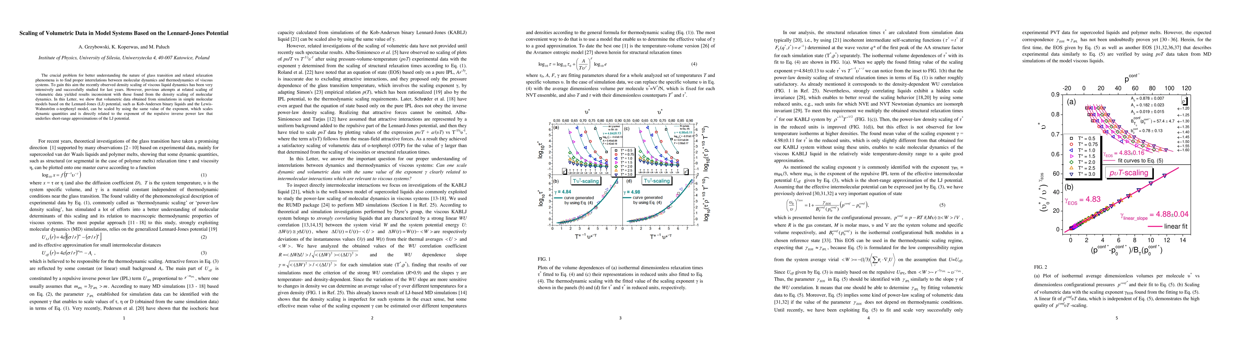 This paper demonstrates that volumetric data from simulations of simple molecular models based on the Lennard-Jones potential, like Kob-Andersen binary liquids and o-terphenyl, can be scaled using a consistent exponent, aligning with density scaling of molecular dynamics and resolving previous inconsistencies.