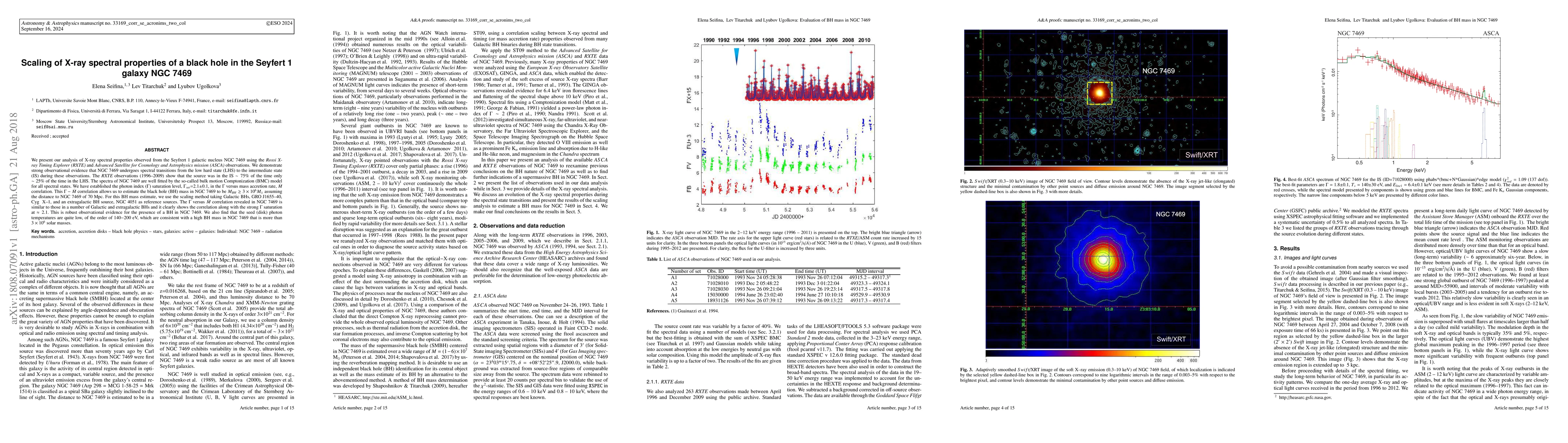 We present our analysis of X-ray spectral properties observed from the Seyfrert 1 galactic nucleus NGC~7469 using the RXTE and ASCA observations. We demonstrate strong observational evidence that NGC~7469 undergoes spectral transitions from the low hard state (LHS) to the intermediate state (IS) during these observations. The RXTE observations (1996--2009) show that the source was in the IS ~ 75 % of the time only, ~ 25 % of the time in the LHS. The spectra of NGC~7469 are well fitted by the so-called bulk motion Comptonization (BMC) model for all spectral states. We have established the photon index saturation level, Gamma_{sat}+2.1+/-0.1, in the Gamma versus mass accretion rate, Mdot correlation. This Gamma- Mdot correlation allows us to estimate the black hole (BH) mass in NGC~7469 to be M__BH> 3 x 10^6 solar masses assuming the distance to NGC~7469 of 70 Mpc. For this BH mass estimate, we use the scaling method taking Galactic BHs, GRO~J1655--40, Cyg~ X--1 and an extragalactic BH source, NGC~4051 as reference sources. The Gamma versus Mdot correlation revealed in NGC~7469 is similar to those in a number of Galactic and extragalactic BHs and it clearly shows the correlation along with the strong Gamma saturation at ~2.1. This is robust observational evidence for the presence of a BH in NGC~7469. We also find that the seed photon temperatures are quite low, of the order of 140-200 eV, which are consistent with a high BH mass in NGC~7469 that is more than 3x10^6 solar masses.