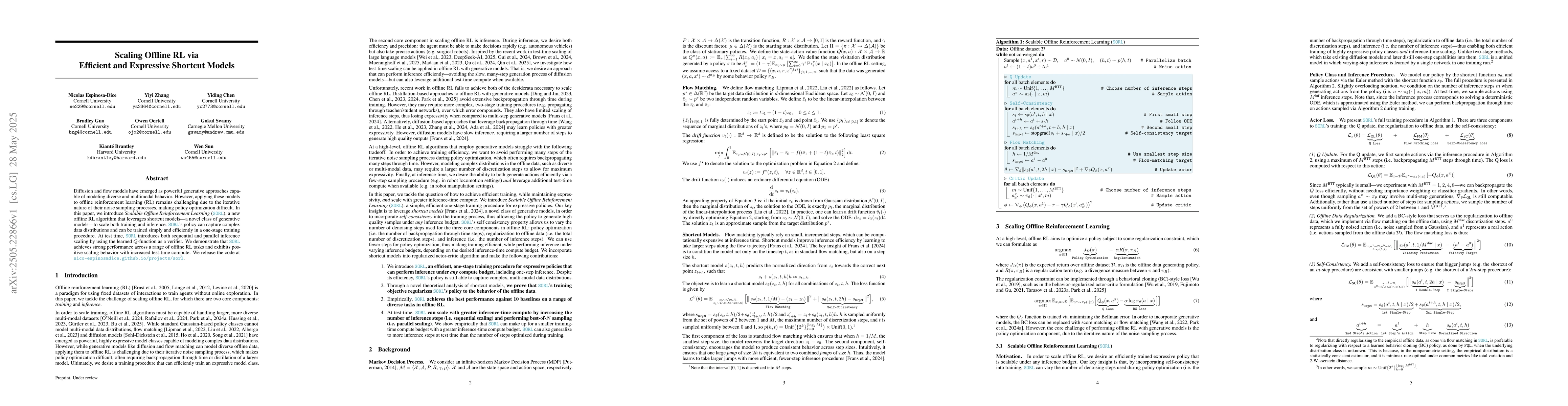 This paper introduces Scalable Offline Reinforcement Learning (SORL), a new algorithm leveraging shortcut models to scale offline RL training and inference, achieving strong performance across various tasks with positive scaling behavior.