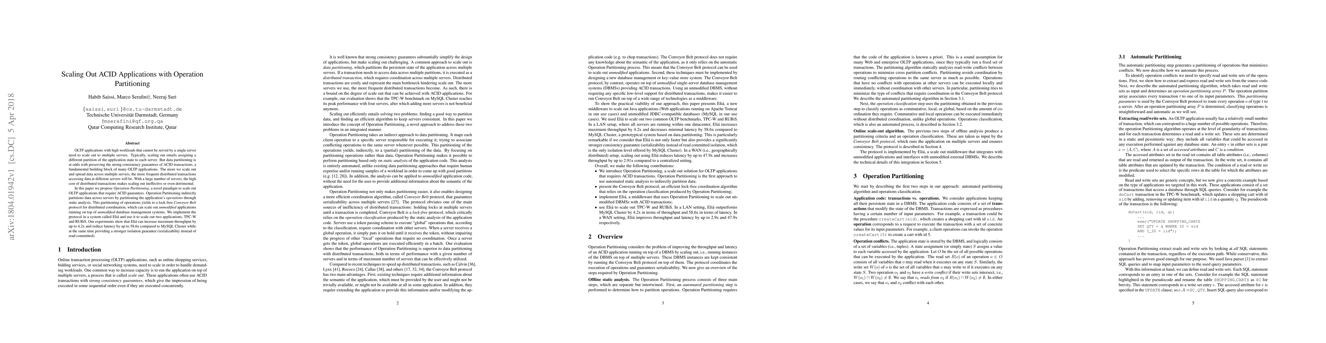 This paper introduces Operation Partitioning, a method to scale out high-workload OLTP applications across multiple servers while maintaining ACID transaction guarantees. It employs a lock-free Conveyor Belt protocol to coordinate operations, enabling significant throughput and latency improvements over traditional distributed transaction methods.