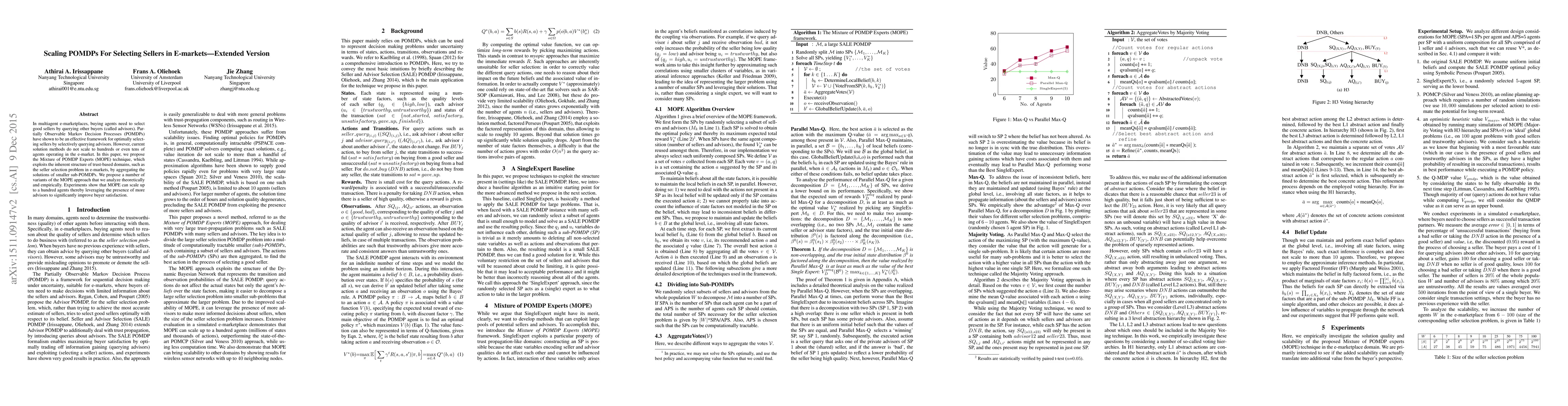 This paper proposes the Mixture of POMDP Experts (MOPE) technique to scale POMDPs for selecting sellers in e-markets, addressing the challenge of querying advisors in large multiagent environments. MOPE aggregates solutions from smaller sub-POMDPs, demonstrating scalability to hundreds of agents and significantly improving buyer satisfaction.
