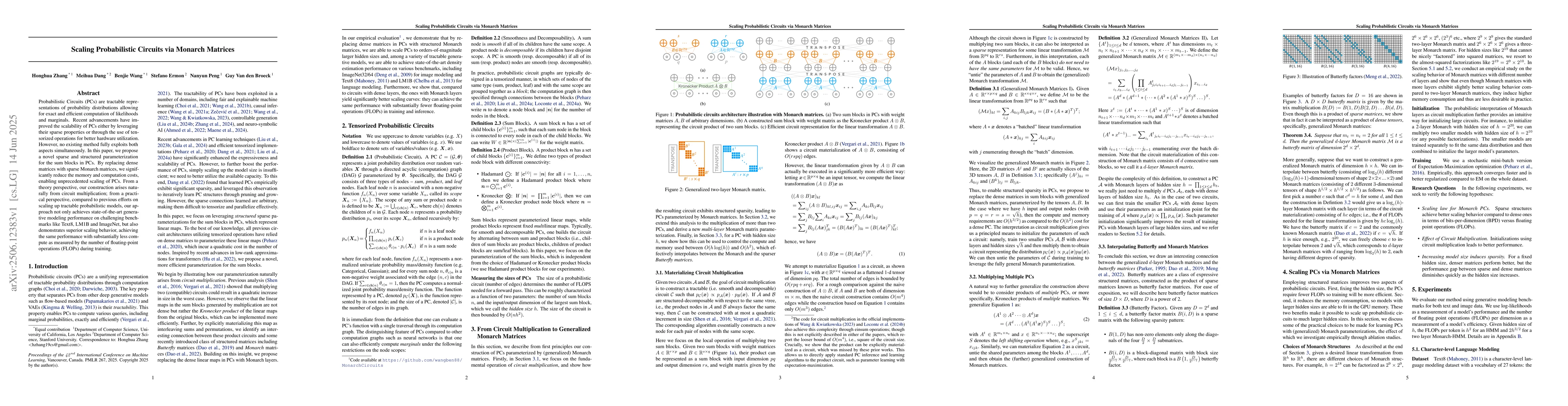 This paper introduces Monarch matrices to enhance the scalability of Probabilistic Circuits (PCs), reducing memory and computation costs by exploiting sparse and structured parameterization. The method outperforms previous approaches, achieving state-of-the-art generative modeling performance on benchmarks like Text8, LM1B, and ImageNet, with significantly lower floating-point operations (FLOPs) during training.