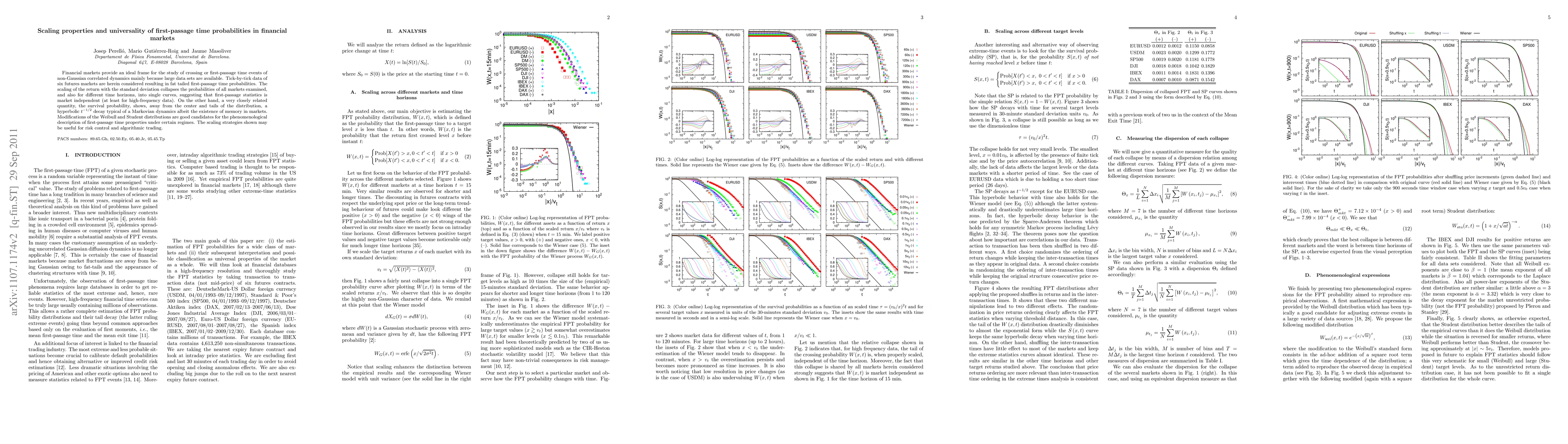 This paper explores first-passage time probabilities in financial markets, revealing that scaling return with standard deviation collapses probabilities across different futures markets into single curves, indicating market-independent first-passage statistics. It also finds that survival probability exhibits a Markovian decay, suggesting memory despite hyperbolic behavior.