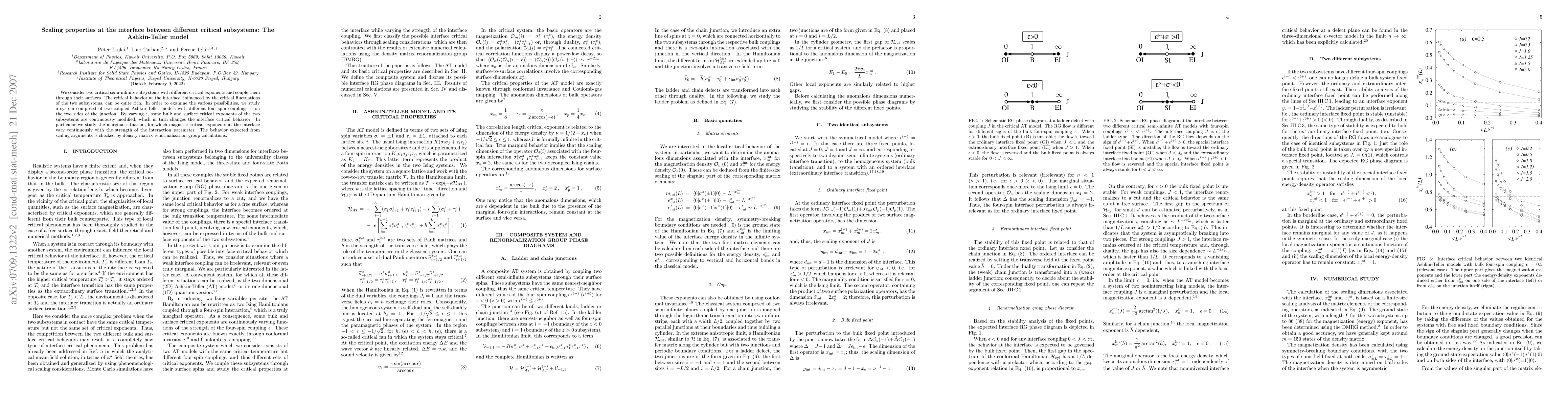 We consider two critical semi-infinite subsystems with different critical exponents and couple them through their surfaces. The critical behavior at the interface, influenced by the critical fluctuations of the two subsystems, can be quite rich. In order to examine the various possibilities, we study a system composed of two coupled Ashkin-Teller models with different four-spin couplings epsilon, on the two sides of the junction. By varying epsilon, some bulk and surface critical exponents of the two subsystems are continuously modified, which in turn changes the interface critical behavior. In particular we study the marginal situation, for which magnetic critical exponents at the interface vary continuously with the strength of the interaction parameter. The behavior expected from scaling arguments is checked by DMRG calculations.