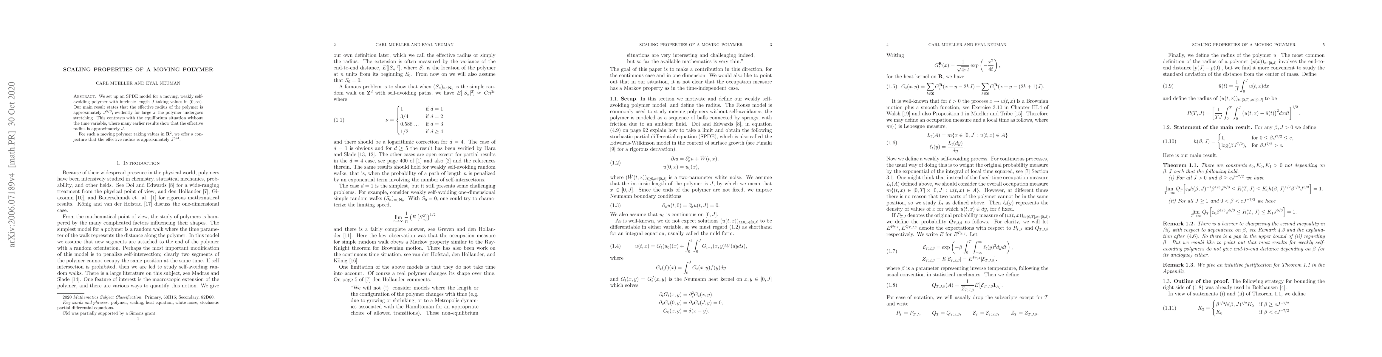 We set up an SPDE model for a moving, weakly self-avoiding polymer with intrinsic length $J$ taking values in $(0,\infty)$. Our main result states that the effective radius of the polymer is approximately $J^{5/3}$; evidently for large $J$ the polymer undergoes stretching. This contrasts with the equilibrium situation without the time variable, where many earlier results show that the effective radius is approximately $J$. For such a moving polymer taking values in $\mathbf{R}^2$, we offer a conjecture that the effective radius is approximately $J^{5/4}$.