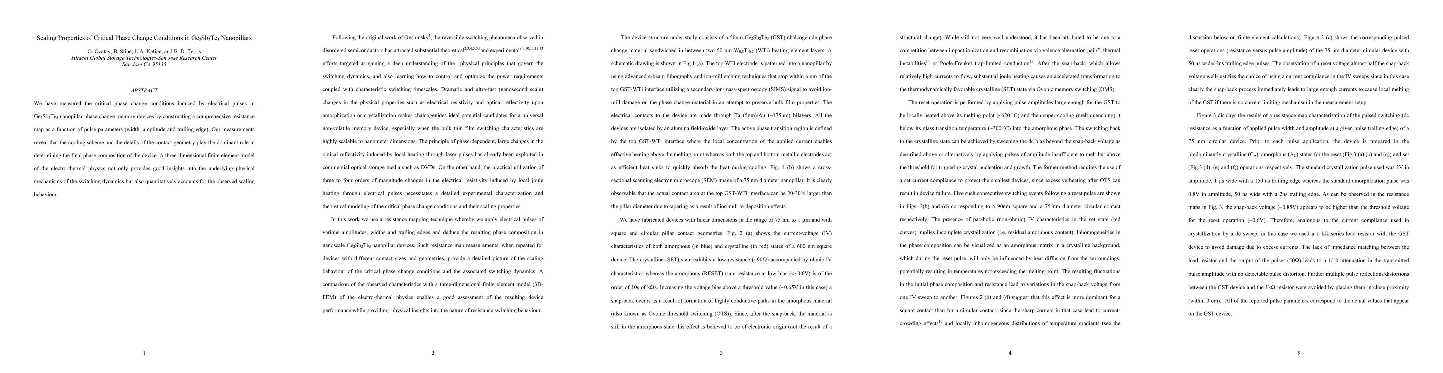 We have measured the critical phase change conditions induced by electrical pulses in Ge2Sb2Te5 nanopillar phase change memory devices by constructing a comprehensive resistance map as a function of pulse parameters (width, amplitude and trailing edge). Our measurements reveal that the cooling scheme and the details of the contact geometry play the dominant role in determining the final phase composition of the device. A three-dimensional finite element model of the electro-thermal physics not only provides good insights into the underlying physical mechanisms of the switching dynamics but also quantitatively accounts for the observed scaling behaviour.