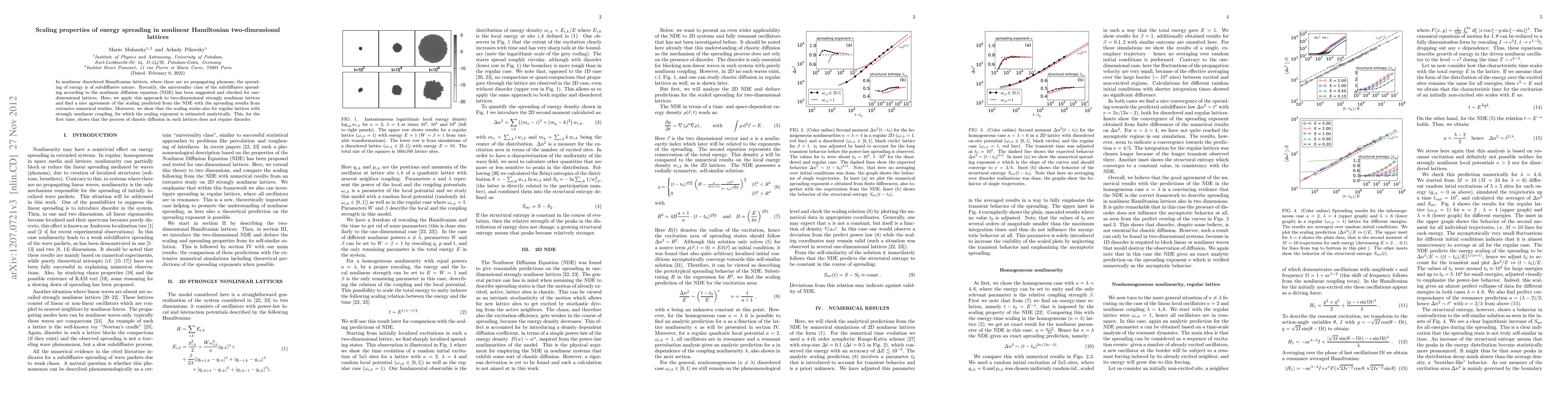 This paper investigates the subdiffusive energy spreading in two-dimensional nonlinear disordered Hamiltonian lattices, confirming the universality class of the nonlinear diffusion equation (NDE) through extensive numerical studies. It also demonstrates that the scaling behavior holds for regular lattices with strong nonlinear coupling, indicating chaotic diffusion does not necessitate disorder.