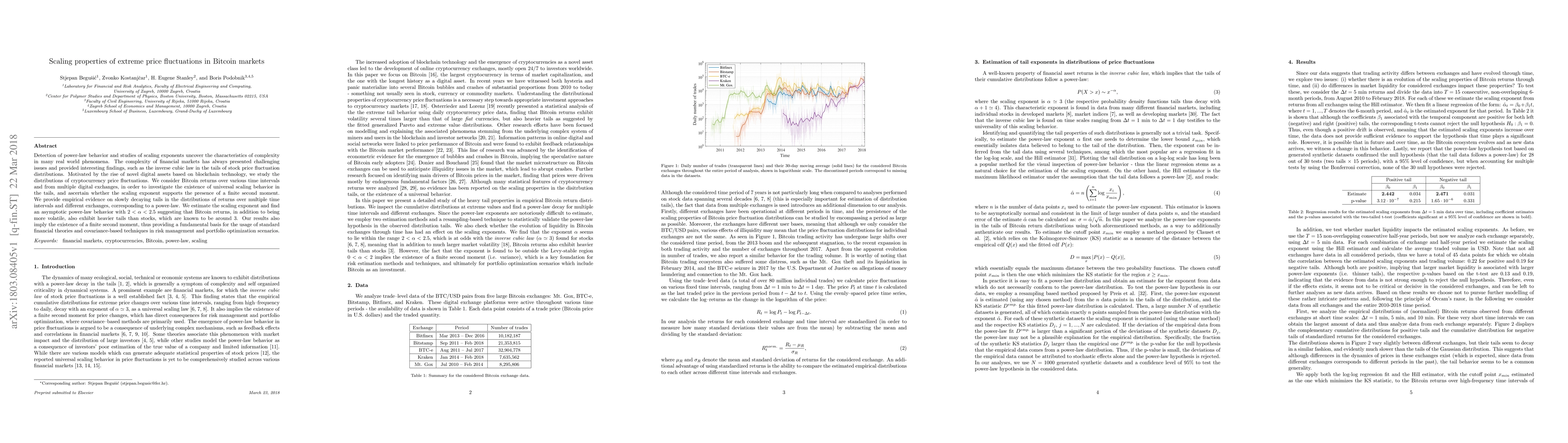 This paper investigates the scaling behavior of extreme price fluctuations in Bitcoin markets, finding evidence of a power-law distribution with a scaling exponent of 2 < α < 2.5, indicating heavier tails than traditional stocks and supporting the use of standard financial theories in risk management.