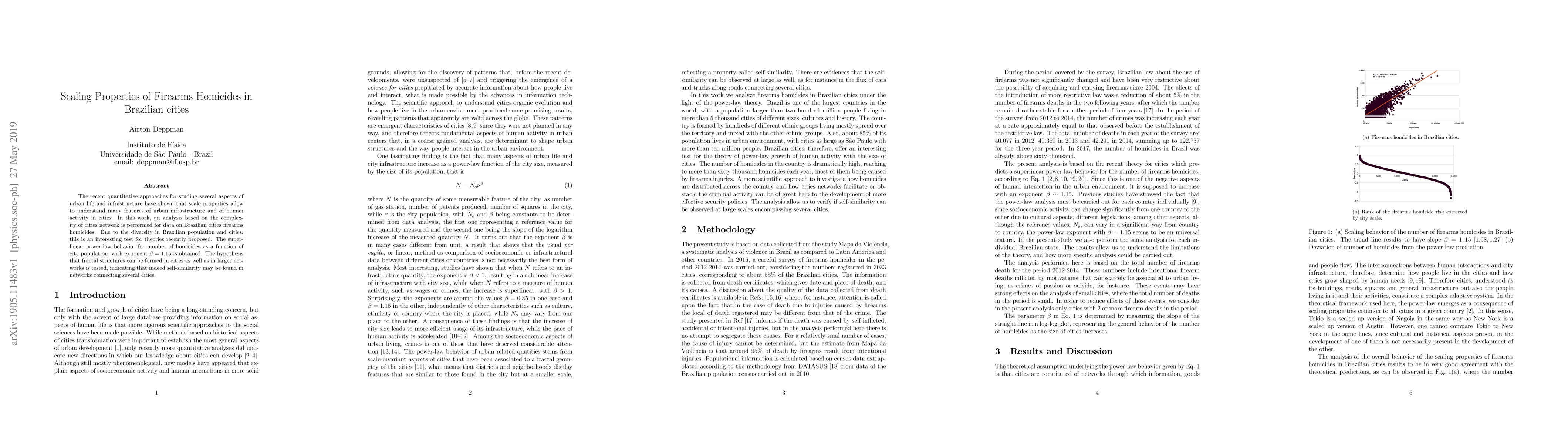 The recent quantitative approaches for studing several aspects of urban life and infrastructure have shown that scale properties allow to understand many features of urban infrastructure and of human activity in cities. In this work, an analysis based on the complexity of cities network is performed for data on Brazilian cities firearms homicides. Due to the diversity in Brazilian population and cities, this is an interesting test for theories recently proposed. The superlinear power-law behavior for number of homicides as a function of city population, with exponent $\beta=1.15$ is obtained. The hypothesis that fractal structures can be formed in cities as well as in larger networks is tested, indicating that indeed self-similarity may be found in networks connecting several cities.
