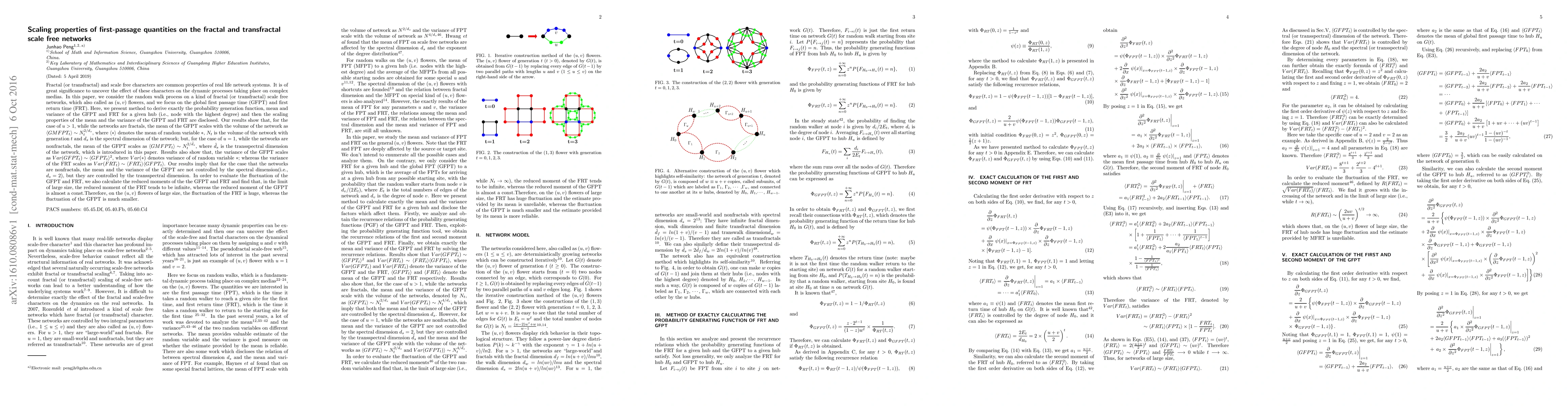 Researchers studied first-passage times on fractal and transfractal networks, finding that mean first passage time scales with network volume for u>1, but not for u=1, and variance of first passage time and return time exhibit specific scaling properties.
