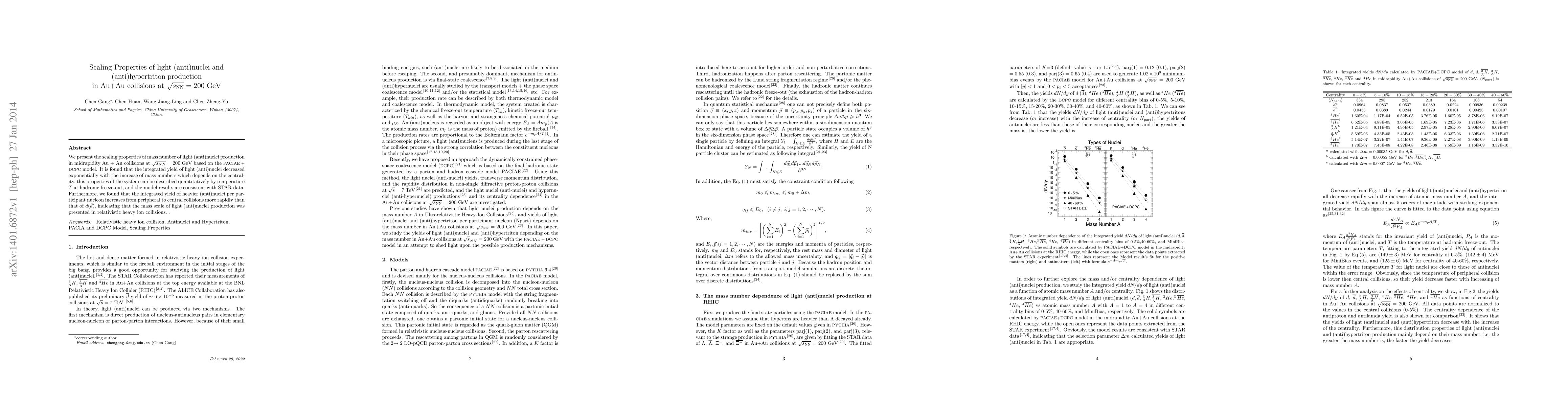 We present the scaling properties of mass number of light (anti)nuclei production in midrapidity Au + Au collisions at $\sqrt {s_{NN}}=200$ GeV based on the PACIAE + DCPC model. It is found that the integrated yield of light (anti)nuclei decreased exponentially with the increase of mass numbers which depends on the centrality, this properties of the system can be described quantitatively by temperature $T$ at hadronic freeze-out, and the model results are consistent with STAR data. Furthermore, we found that the integrated yield of heavier (anti)nuclei per participant nucleon increases from peripheral to central collisions more rapidly than that of $d(\bar{d})$, indicating that the mass scale of light (anti)nuclei production was presented in relativistic heavy ion collisions.