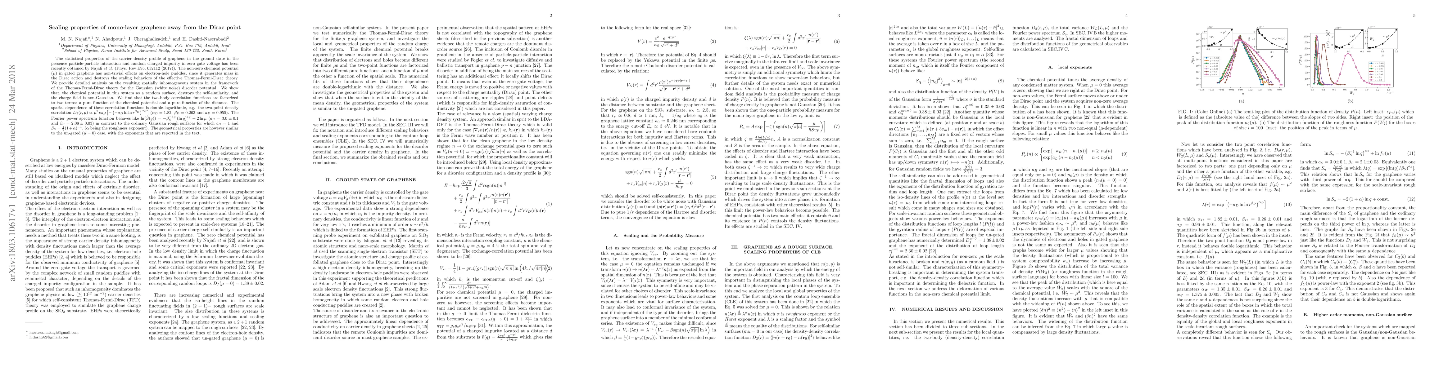The statistical properties of the carrier density profile of graphene in the ground state in the presence particle-particle interaction and random charged impurity in zero gate voltage has been recently obtained by Najafi \textit{et al.} (Phys. Rev E95, 032112 (2017)). The non-zero chemical potential ($\mu$) in gated graphene has non-trivial effects on electron-hole puddles, since it generates mass in the Dirac action and destroys the scaling behaviors of the effective Thomas-Fermi-Dirac theory. We provide detailed analysis on the resulting spatially inhomogeneous system in the framework of the Thomas-Fermi-Dirac theory for the Gaussian (white noise) disorder potential. We show that, the chemical potential in this system as a random surface, destroys the self-similarity, and the charge field is non-Gaussian. We find that the two-body correlation functions are factorized to two terms: a pure function of the chemical potential and a pure function of the distance. The spatial dependence of these correlation functions is double-logarithmic, e.g. the two-point density correlation $D_2(r,\mu)\propto \mu^2\exp\left[-\left(-a_D\ln\ln r^{\beta_D}\right)^{\alpha_D} \right]$ ($\alpha_D=1.82$, $\beta_D=0.263$ and $a_D=0.955$). The Fourier power spectrum function behaves like $\ln(S(q))=-\beta_S^{-a_S}\left(\ln q \right)^{a_S}+2\ln \mu$ ($a_S=3.0\pm 0.1$ and $\beta_S=2.08\pm 0.03$) in contrast to the ordinary Gaussian rough surfaces for which $a_S=1$ and $\beta_S=\frac{1}{2}(1+\alpha)^{-1}$, ($\alpha$ being the roughness exponent). The geometrical properties are however similar to the un-gated ($\mu=0$) case, with the exponents that are reported in the text.