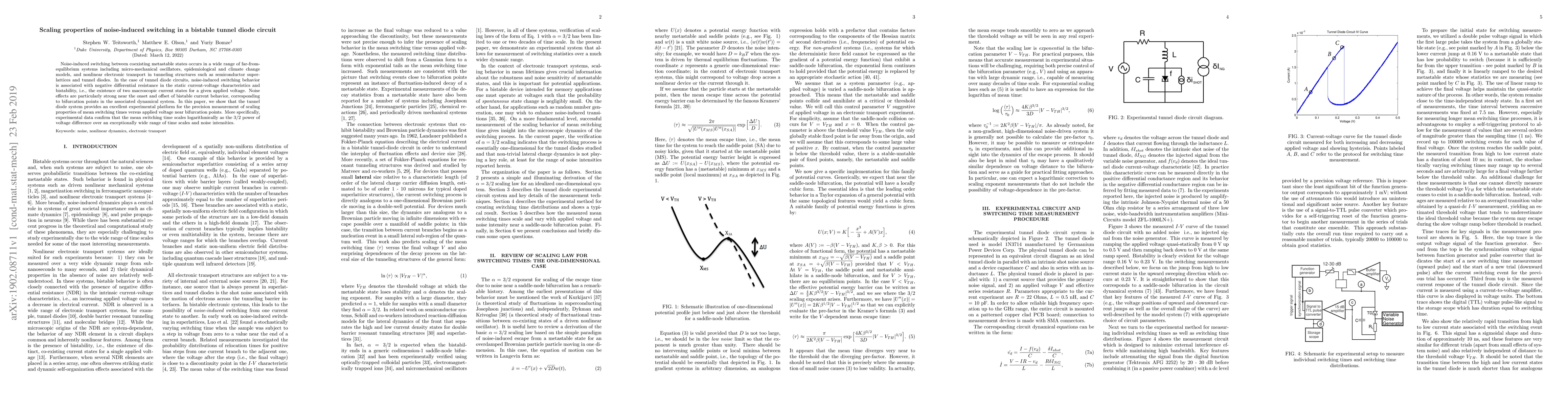 This paper investigates noise-induced switching in bistable tunnel diode circuits, demonstrating that mean switching times scale logarithmically with the 3/2 power of voltage difference near bifurcation points, providing a precise experimental platform for studying such scaling properties.