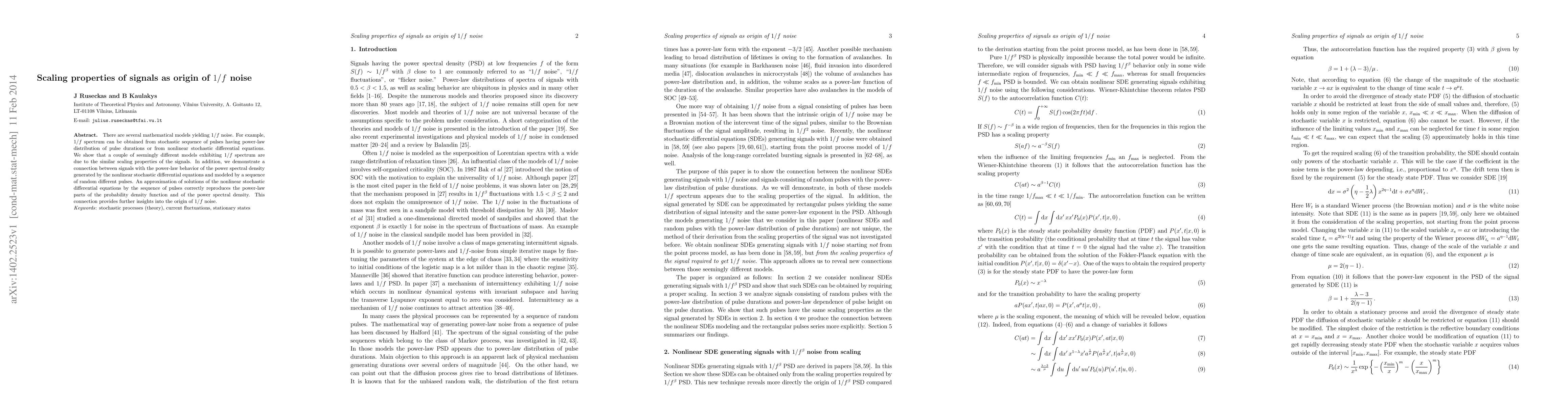The novelty of this work lies in connecting seemingly different models (nonlinear SDEs and stochastic pulse sequences) through their shared scaling properties, offering a unified perspective on the origin of 1/f noise.
