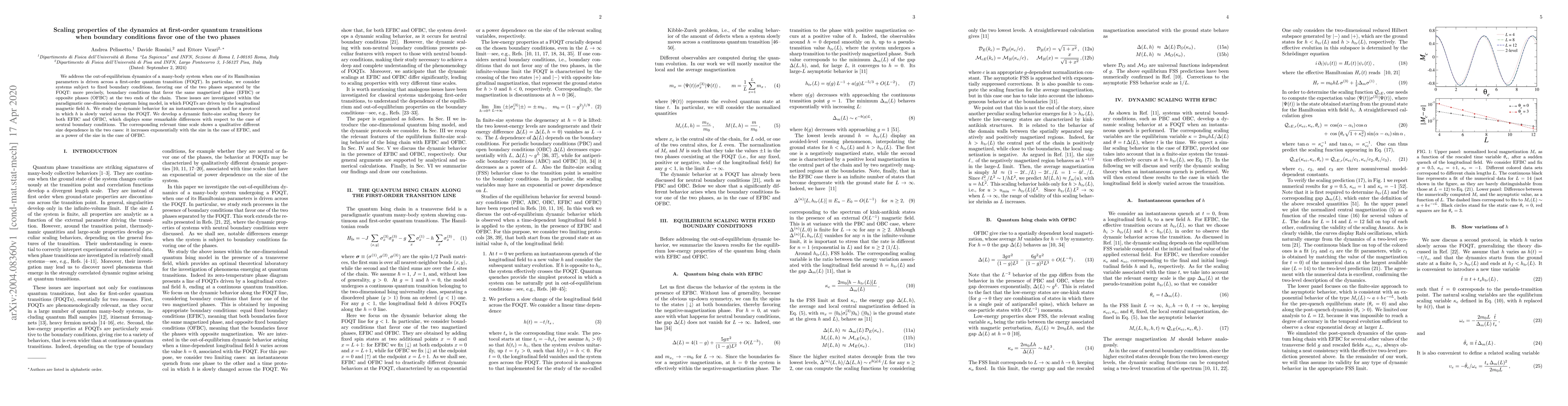This paper investigates the dynamics of a one-dimensional quantum Ising model undergoing a first-order quantum transition, focusing on how boundary conditions favoring one or both phases affect the scaling properties of the system's dynamics. It develops a dynamic finite-size scaling theory revealing distinct time scale behavior: exponential growth with size for boundary conditions favoring the same phase, and power-law growth for conditions favoring opposite phases.