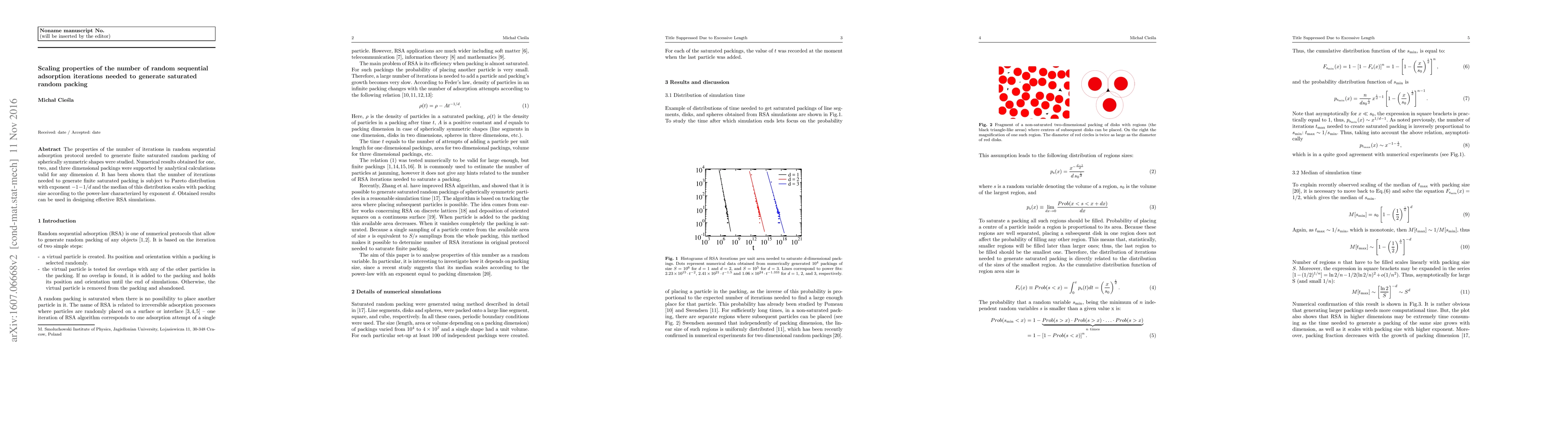 The properties of the number of iterations in random sequential adsorption protocol needed to generate finite saturated random packing of spherically symmetric shapes were studied. Numerical results obtained for one, two, and three dimensional packings were supported by analytical calculations valid for any dimension $d$. It has been shown that the number of iterations needed to generate finite saturated packing is subject to Pareto distribution with exponent $-1-1/d$ and the median of this distribution scales with packing size according to the power-law characterized by exponent $d$. Obtained resultscan be used in designing effective RSA simulations.