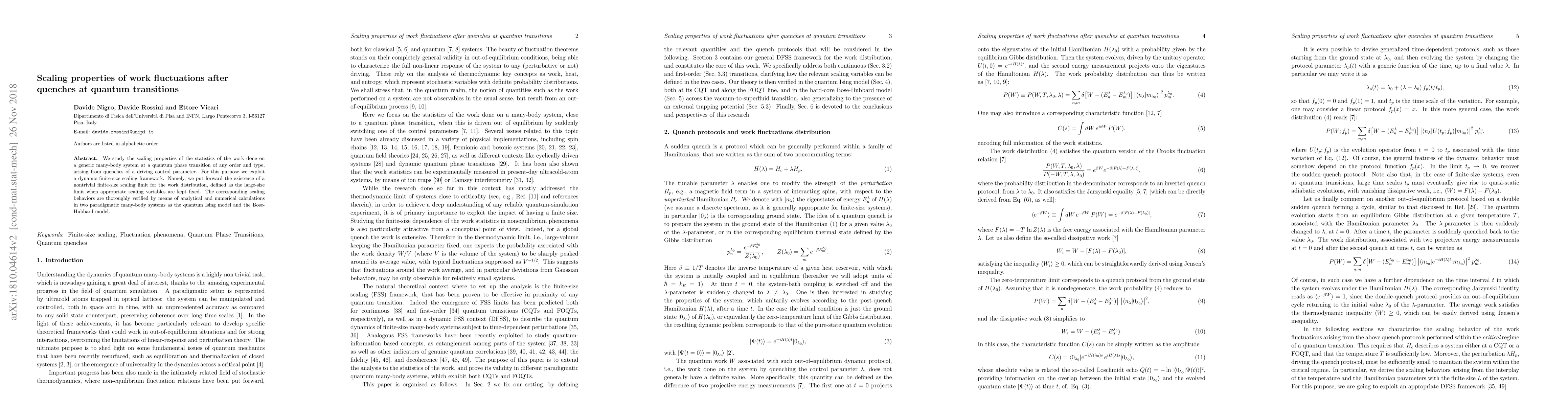 This paper investigates the scaling properties of work fluctuations in many-body systems undergoing quantum phase transitions via quenches. It establishes a nontrivial finite-size scaling limit for the work distribution and verifies these behaviors analytically and numerically in the quantum Ising and Bose-Hubbard models.