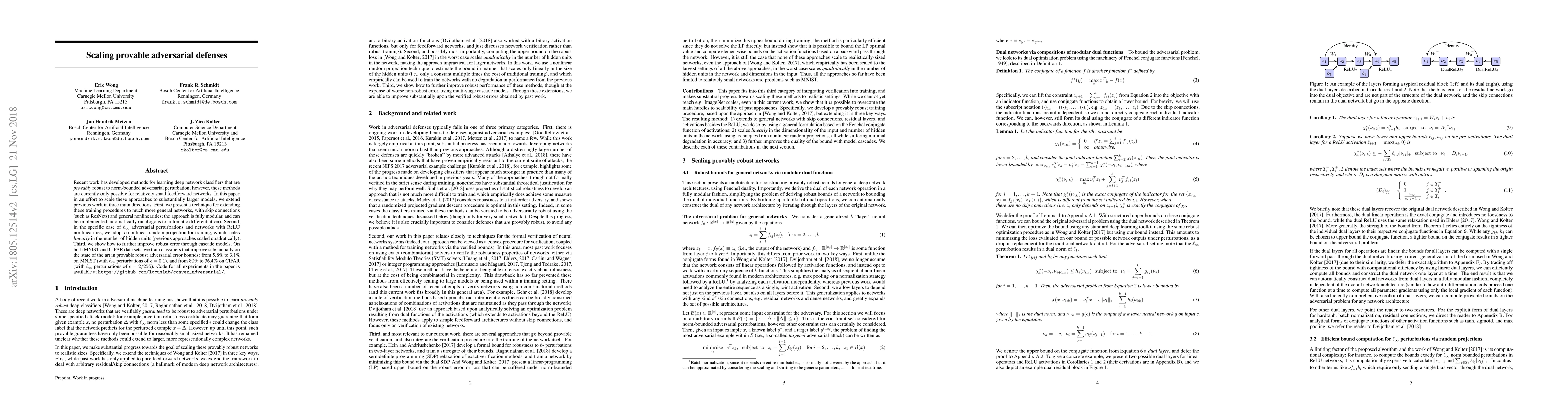 Recent work has developed methods for learning deep network classifiers that are provably robust to norm-bounded adversarial perturbation; however, these methods are currently only possible for relatively small feedforward networks. In this paper, in an effort to scale these approaches to substantially larger models, we extend previous work in three main directions. First, we present a technique for extending these training procedures to much more general networks, with skip connections (such as ResNets) and general nonlinearities; the approach is fully modular, and can be implemented automatically (analogous to automatic differentiation). Second, in the specific case of $\ell_\infty$ adversarial perturbations and networks with ReLU nonlinearities, we adopt a nonlinear random projection for training, which scales linearly in the number of hidden units (previous approaches scaled quadratically). Third, we show how to further improve robust error through cascade models. On both MNIST and CIFAR data sets, we train classifiers that improve substantially on the state of the art in provable robust adversarial error bounds: from 5.8% to 3.1% on MNIST (with $\ell_\infty$ perturbations of $\epsilon=0.1$), and from 80% to 36.4% on CIFAR (with $\ell_\infty$ perturbations of $\epsilon=2/255$). Code for all experiments in the paper is available at https://github.com/locuslab/convex_adversarial/.