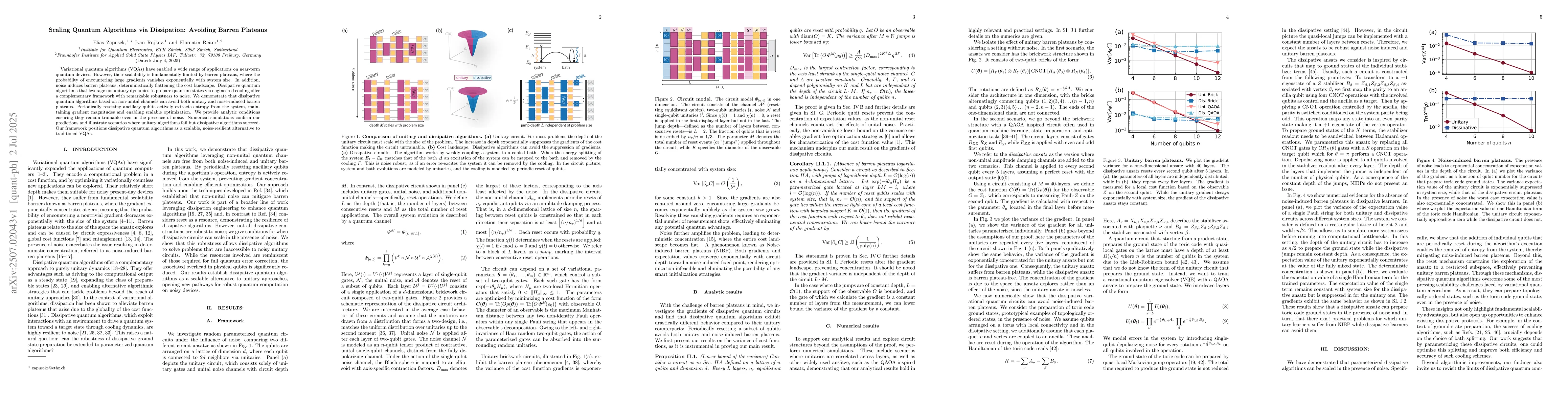 This research introduces dissipative quantum algorithms as a solution to barren plateaus in variational quantum algorithms, which limit scalability. By using nonunitary dynamics and periodic resetting of ancillary qubits, these dissipative methods maintain gradient magnitudes and are robust to noise, offering a scalable and noise-resilient alternative to traditional VQAs.