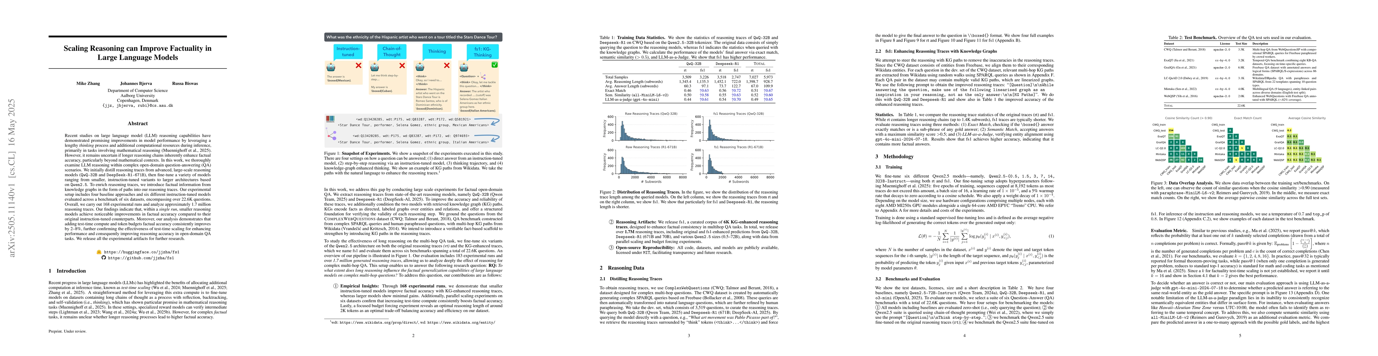 Recent studies on large language model (LLM) reasoning capabilities have demonstrated promising improvements in model performance by leveraging a lengthy thinking process and additional computational resources during inference, primarily in tasks involving mathematical reasoning (Muennighoff et al., 2025). However, it remains uncertain if longer reasoning chains inherently enhance factual accuracy, particularly beyond mathematical contexts. In this work, we thoroughly examine LLM reasoning within complex open-domain question-answering (QA) scenarios. We initially distill reasoning traces from advanced, large-scale reasoning models (QwQ-32B and DeepSeek-R1-671B), then fine-tune a variety of models ranging from smaller, instruction-tuned variants to larger architectures based on Qwen2.5. To enrich reasoning traces, we introduce factual information from knowledge graphs in the form of paths into our reasoning traces. Our experimental setup includes four baseline approaches and six different instruction-tuned models evaluated across a benchmark of six datasets, encompassing over 22.6K questions. Overall, we carry out 168 experimental runs and analyze approximately 1.7 million reasoning traces. Our findings indicate that, within a single run, smaller reasoning models achieve noticeable improvements in factual accuracy compared to their original instruction-tuned counterparts. Moreover, our analysis demonstrates that adding test-time compute and token budgets factual accuracy consistently improves by 2-8%, further confirming the effectiveness of test-time scaling for enhancing performance and consequently improving reasoning accuracy in open-domain QA tasks. We release all the experimental artifacts for further research.