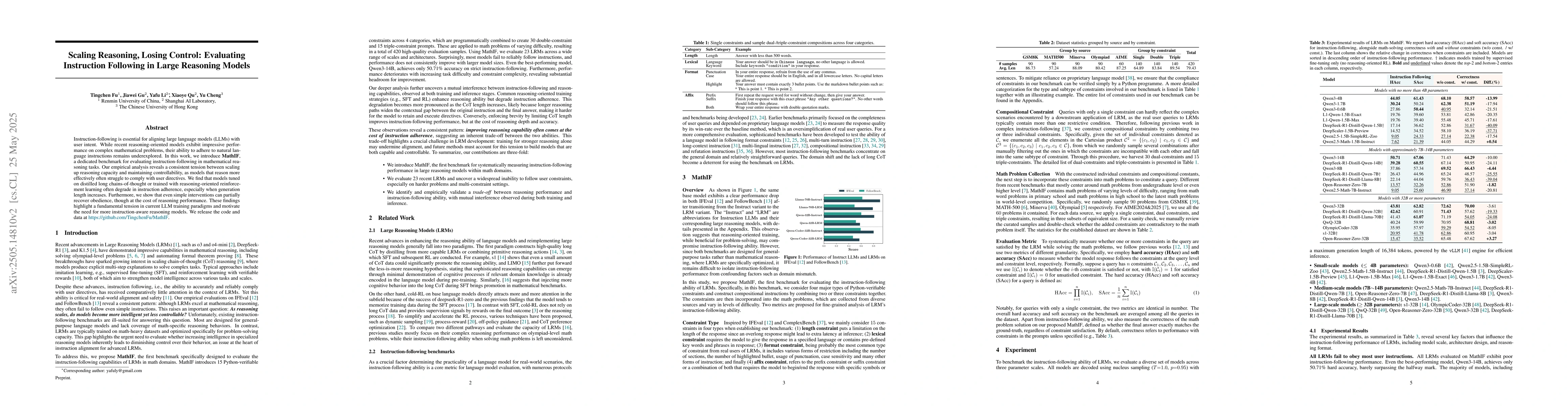 MathIF benchmark and empirical analysis demonstrating the trade-off between scaling reasoning capacity and maintaining controllability in LLMs.