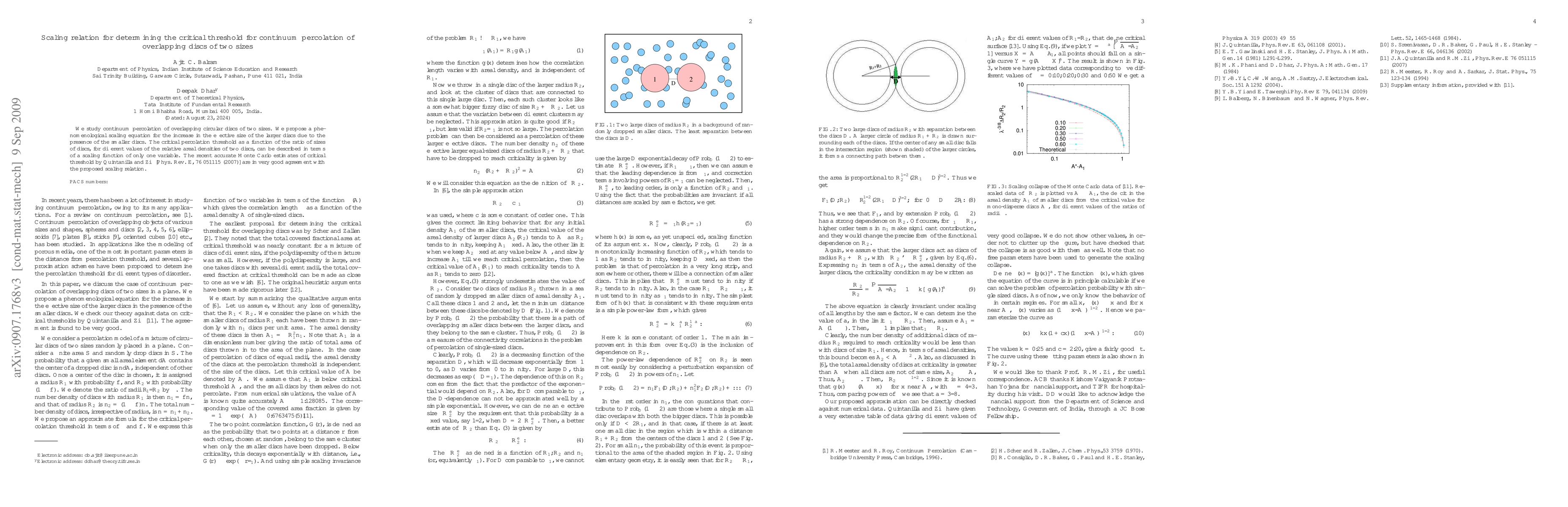 This paper proposes a scaling equation to determine the critical threshold for continuum percolation of overlapping discs of two sizes, showing that the critical percolation threshold can be described by a single scaling function. The proposed model aligns well with recent Monte Carlo estimates.
