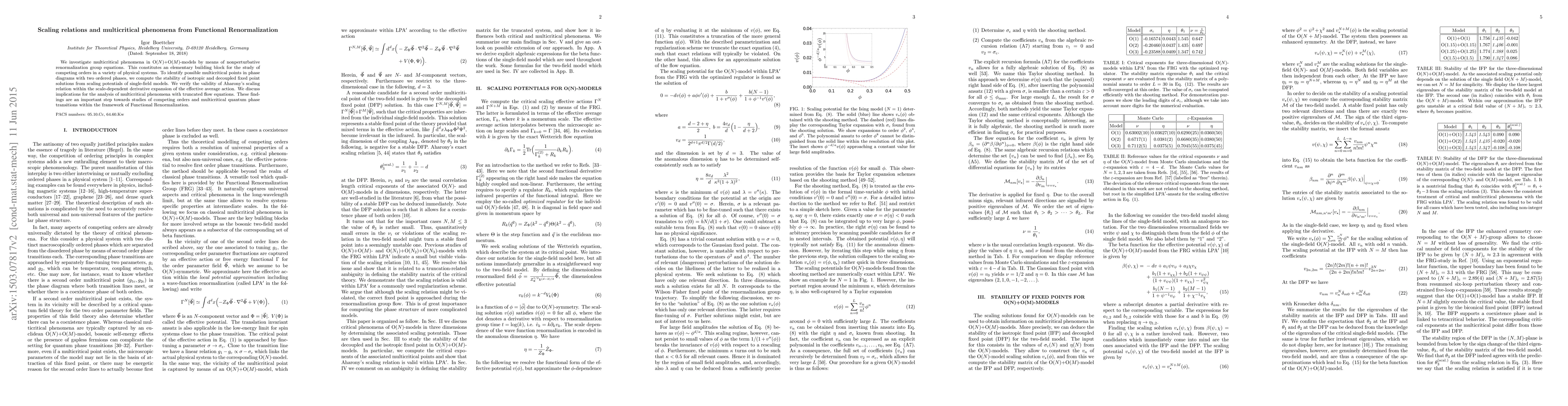 We investigate multicritical phenomena in O(N)+O(M)-models by means of nonperturbative renormalization group equations. This constitutes an elementary building block for the study of competing orders in a variety of physical systems. To identify possible multicritical points in phase diagrams with two ordered phases, we compute the stability of isotropic and decoupled fixed point solutions from scaling potentials of single-field models. We verify the validity of Aharony's scaling relation within the scale-dependent derivative expansion of the effective average action. We discuss implications for the analysis of multicritical phenomena with truncated flow equations. These findings are an important step towards studies of competing orders and multicritical quantum phase transitions within the framework of Functional Renormalization.