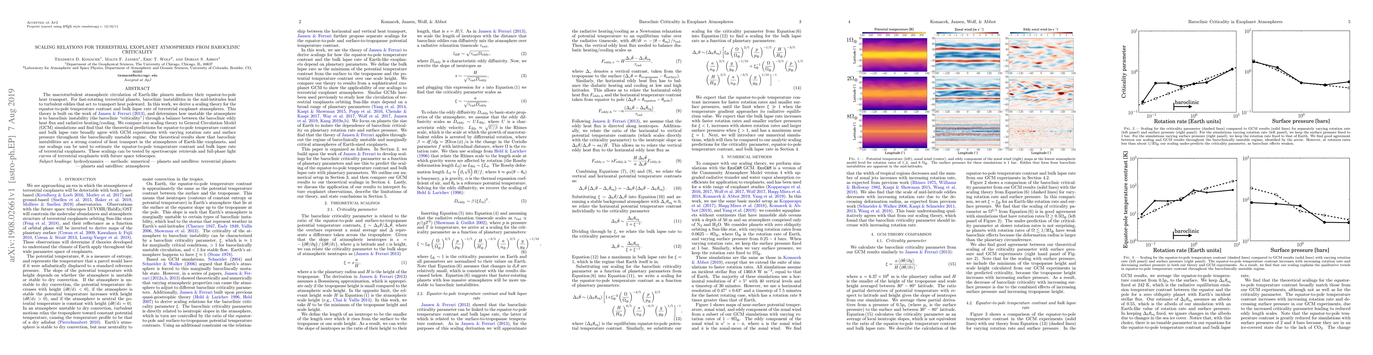This paper develops a scaling theory for the heat transport in Earth-like exoplanet atmospheres based on baroclinic criticality, showing strong agreement with GCM simulations. The derived scalings can estimate temperature contrasts and lapse rates, which can be tested with future spectroscopic observations.