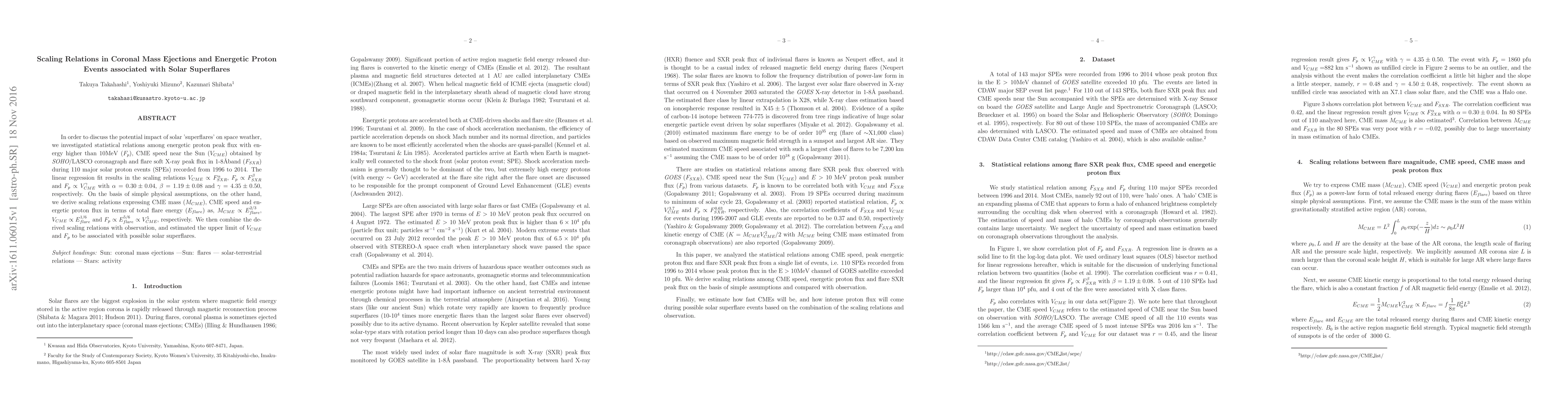 This paper investigates statistical scaling relations between energetic proton flux, coronal mass ejection (CME) speed, and solar flare X-ray flux during major solar proton events. The results show linear relationships, including $V_{CME} \propto F_{SXR}^{0.30}$ and $F_p \propto F_{SXR}^{1.19}$, and derive theoretical scaling relations in terms of flare energy, estimating upper limits for CME speed and proton flux associated with solar superflares.