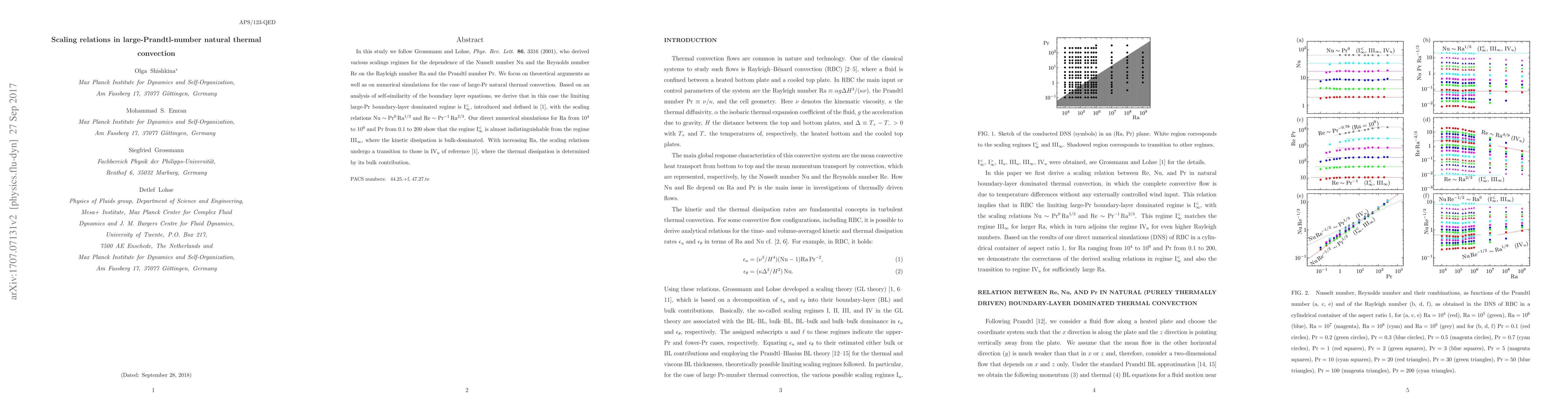 In this study we follow Grossmann and Lohse, Phys. Rev. Lett. 86 (2001), who derived various scalings regimes for the dependence of the Nusselt number $Nu$ and the Reynolds number $Re$ on the Rayleigh number $Ra$ and the Prandtl number $Pr$. We focus on theoretical arguments as well as on numerical simulations for the case of large-$Pr$ natural thermal convection. Based on an analysis of self-similarity of the boundary layer equations, we derive that in this case the limiting large-$Pr$ boundary-layer dominated regime is I$_\infty^<$, introduced and defined in [1], with the scaling relations $Nu\sim Pr^0\,Ra^{1/3}$ and $Re\sim Pr^{-1}\,Ra^{2/3}$. Our direct numerical simulations for $Ra$ from $10^4$ to $10^9$ and $Pr$ from 0.1 to 200 show that the regime I$_\infty^<$ is almost indistinguishable from the regime III$_\infty$, where the kinetic dissipation is bulk-dominated. With increasing $Ra$, the scaling relations undergo a transition to those in IV$_u$ of reference [1], where the thermal dissipation is determined by its bulk contribution.