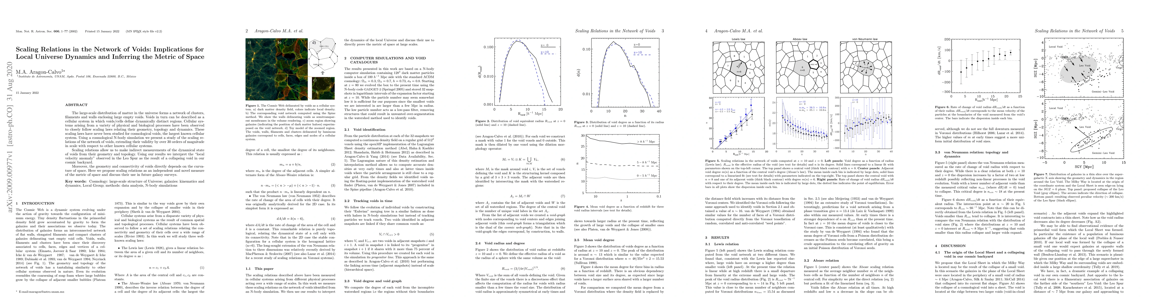 The large-scale distribution of matter in the universe forms a network of clusters, filaments and walls enclosing large empty voids. Voids in turn can be described as a cellular system in which voids/cells define dynamically distinct regions. Cellular systems arising from a variety of physical and biological processes have been observed to closely follow scaling laws relating their geometry, topology and dynamics. These scaling laws have never been studied for cosmological voids, the largest known cellular system. Using a cosmological N-body simulation we present a study of the scaling relations of the network of voids, extending their validity by over 30 orders of magnitude in scale with respect to other known cellular systems. Scaling relations allow us to make indirect measurements of the dynamical state of voids from their geometry and topology. Using our results we interpret the "local velocity anomaly" observed in the Leo Spur as the result of a collapsing void in our cosmic backyard. Moreover, the geometry and connectivity of voids directly depends on the curvature of space. Here we propose scaling relations as an independent and novel measure of the metric of space and discuss their use in future galaxy surveys.