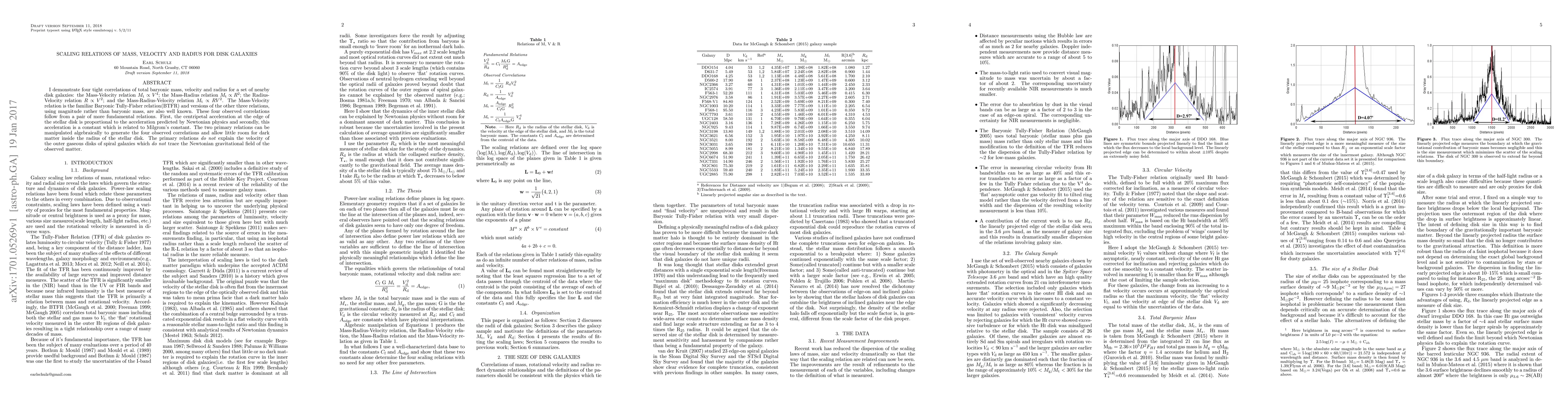 I demonstrate four tight correlations of total baryonic mass, velocity and radius for a set of nearby disk galaxies: the Mass-Velocity relation $ Mt \propto V^4$; the Mass-Radius relation $ Mt \propto R^2$; the Radius-Velocity relation $R \propto V^2$; and the Mass-Radius-Velocity relation $ Mt \propto R V^2$. The Mass-Velocity relation is the familiar Baryonic Tully-Fisher relation(BTFR) and versions of the other three relations, using magnitude rather than baryonic mass, are also well known. These four observed correlations follow from a pair of more fundamental relations. First, the centripetal acceleration at the edge of the stellar disk is proportional to the acceleration predicted by Newtonian physics and secondly, this acceleration is a constant which is related to Milgrom's constant. The two primary relations can be manipulated algebraically to generate the four observed correlations and allow little room for dark matter inside the radius of the stellar disk. The primary relations do not explain the velocity of the outer gaseous disks of spiral galaxies which do not trace the Newtonian gravitational field of the observed matter.