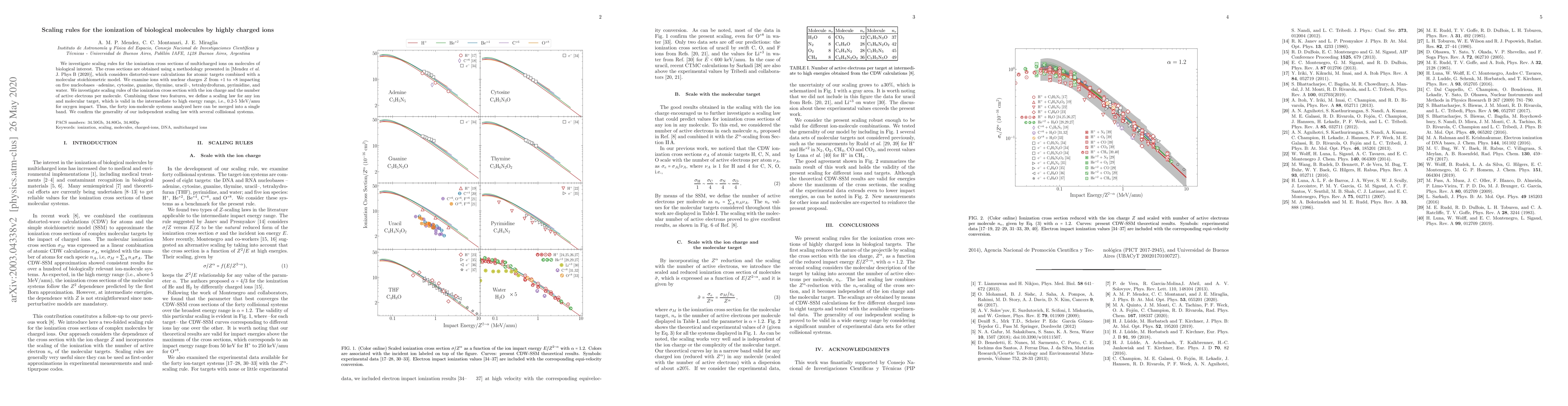 This paper explores scaling rules for ionization cross sections of biological molecules by highly charged ions, using a combined distorted-wave and molecular stoichiometric model. The study defines a universal scaling law valid for ion charges from +1 to +8 impacting nucleobases and other relevant molecules, merging forty ion-molecule systems into a single band.