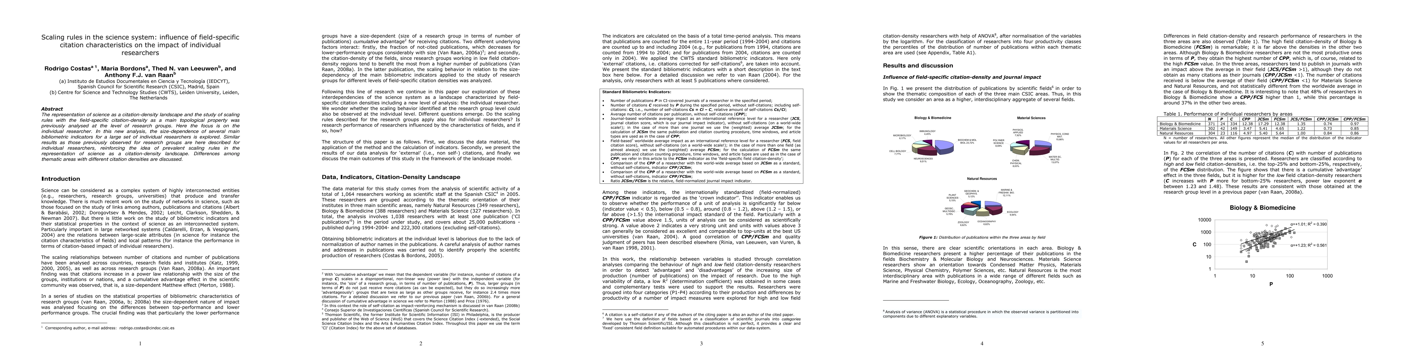 The representation of science as a citation-density landscape and the study of scaling rules with the field-specific citation-density as a main topological property was previously analysed at the level of research groups. Here the focus is on the individual researcher. In this new analysis, the size-dependence of several main bibliometric indicators for a large set of individual researchers is explored. Similar results as those previously observed for research groups are here described for individual researchers, reinforcing the idea of prevalent scaling rules in the representation of science as a citation-density landscape. Differences among thematic areas with different citation densities are discussed.